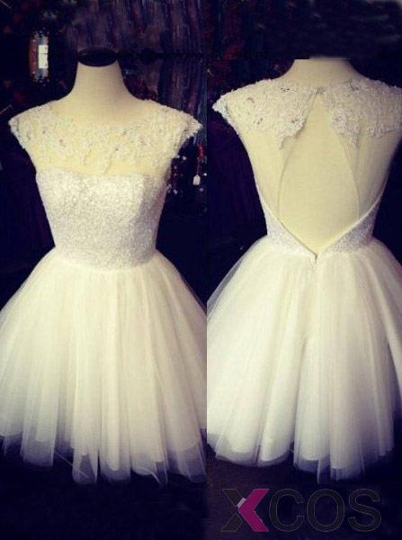 2015 Elegant A-line Short Scoop Neck Open Back Tulle Appliques Homecoming Dress TUHD-7300