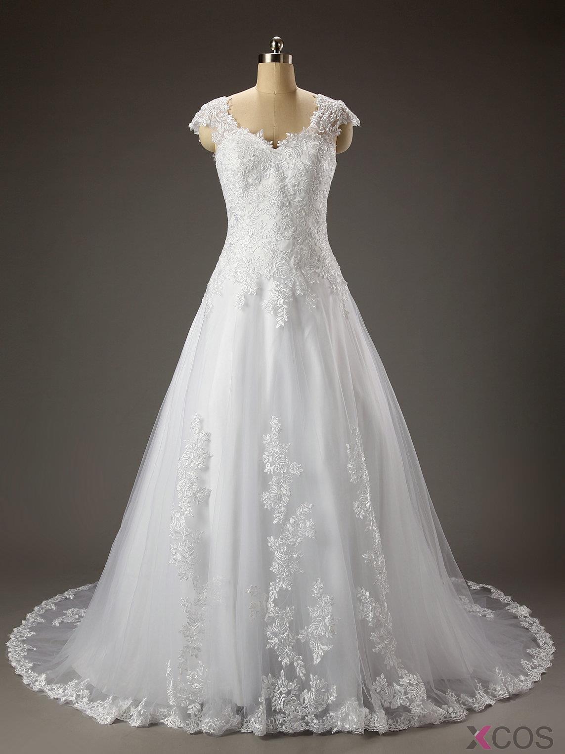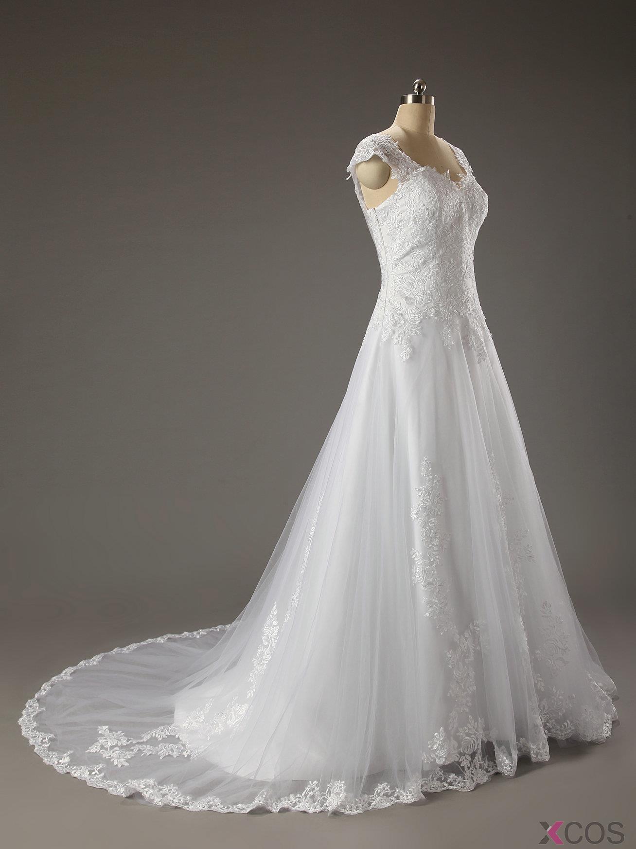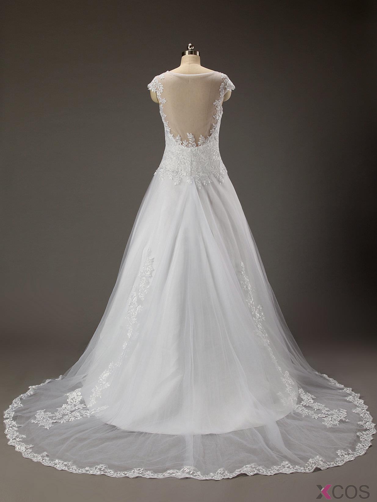 2015 New Arrival A-line Sweetheart Capped Tulle Appliques Wedding Dress TUWD-7349