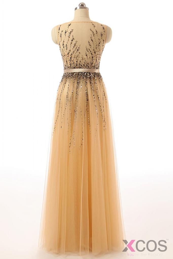 • Beaded Gold Long Cap Sleeves Modest Prom Party Dresses ED0855