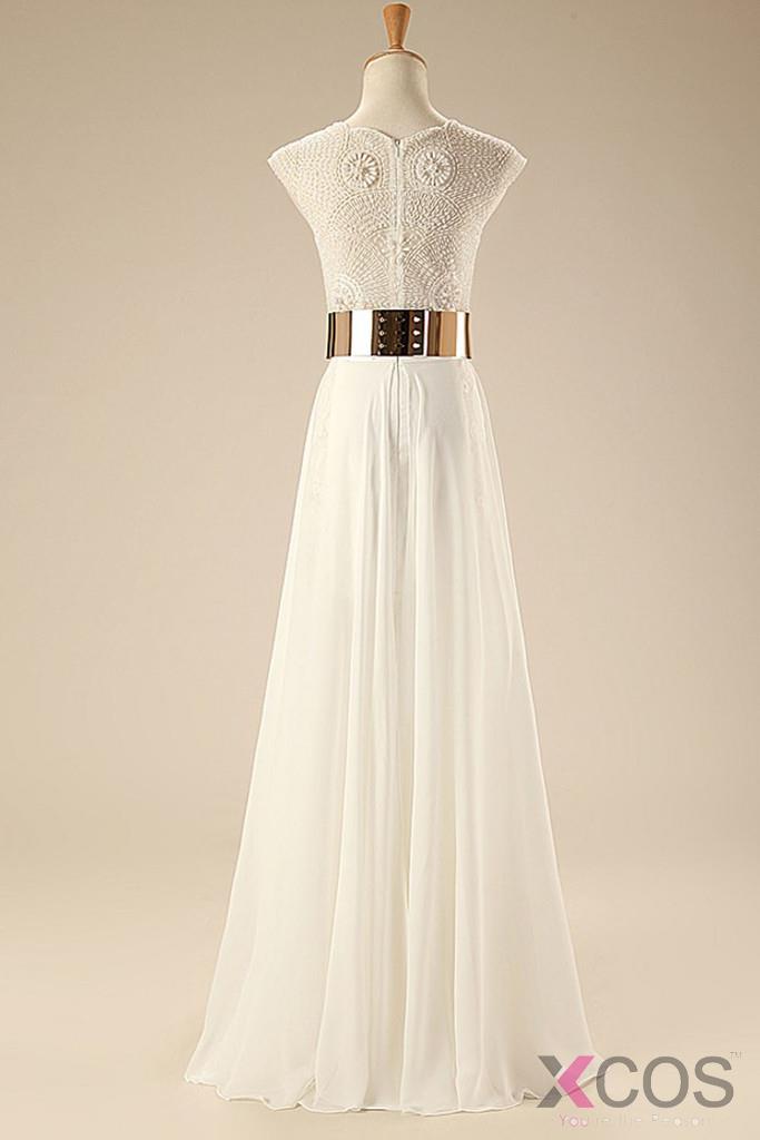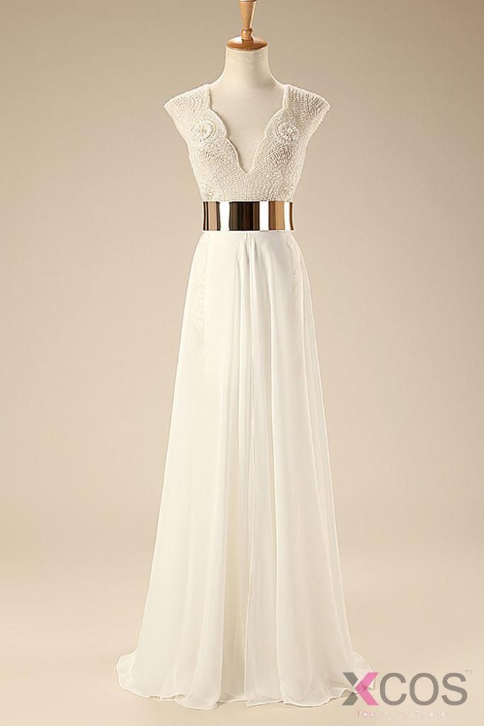 • Deep V Neck Cap Sleeves White Chiffon Gold Belt Summer Beach Wedding Dress WD0106