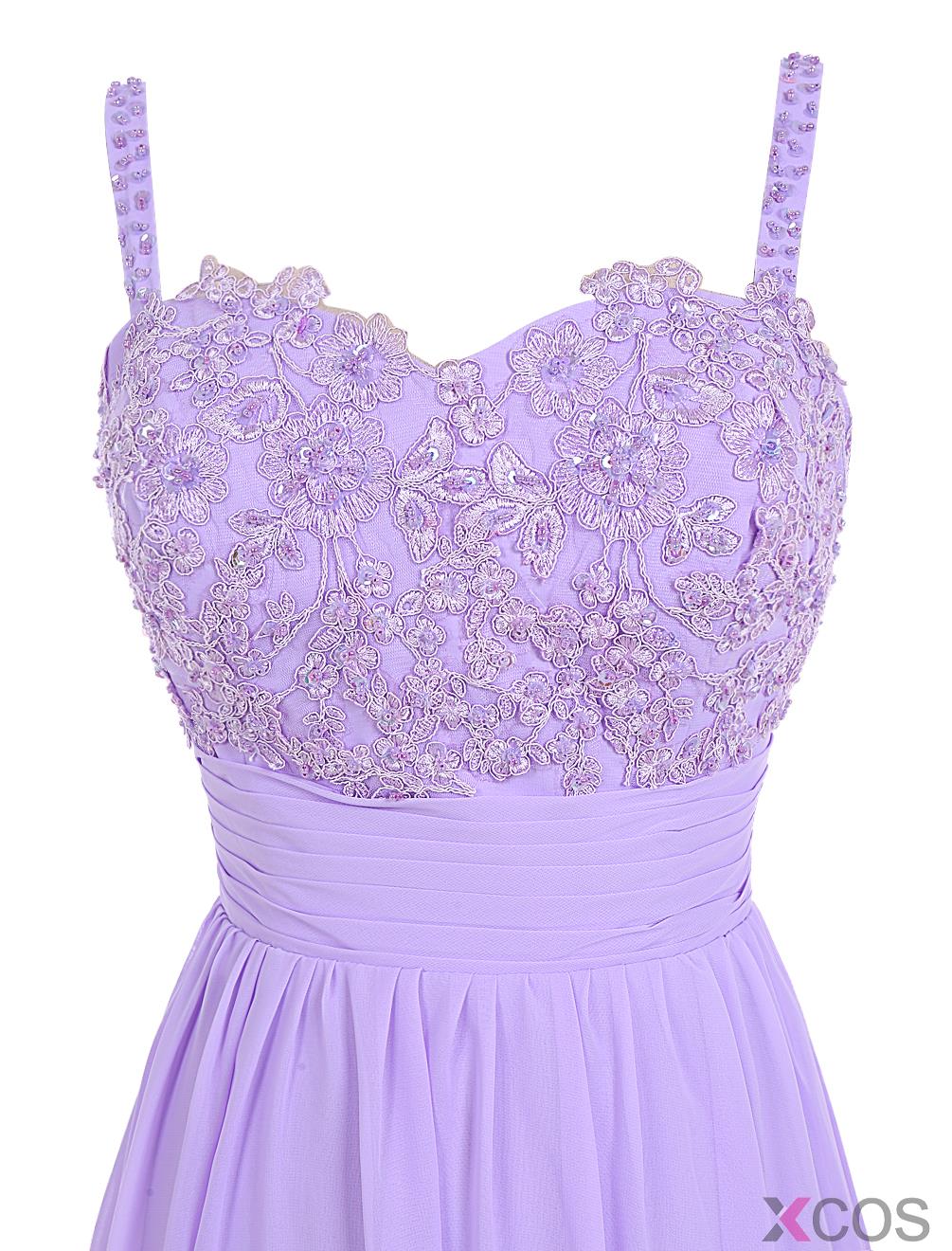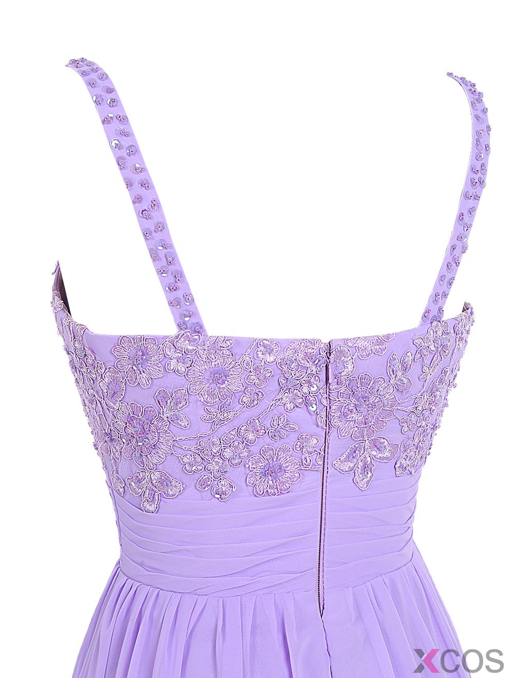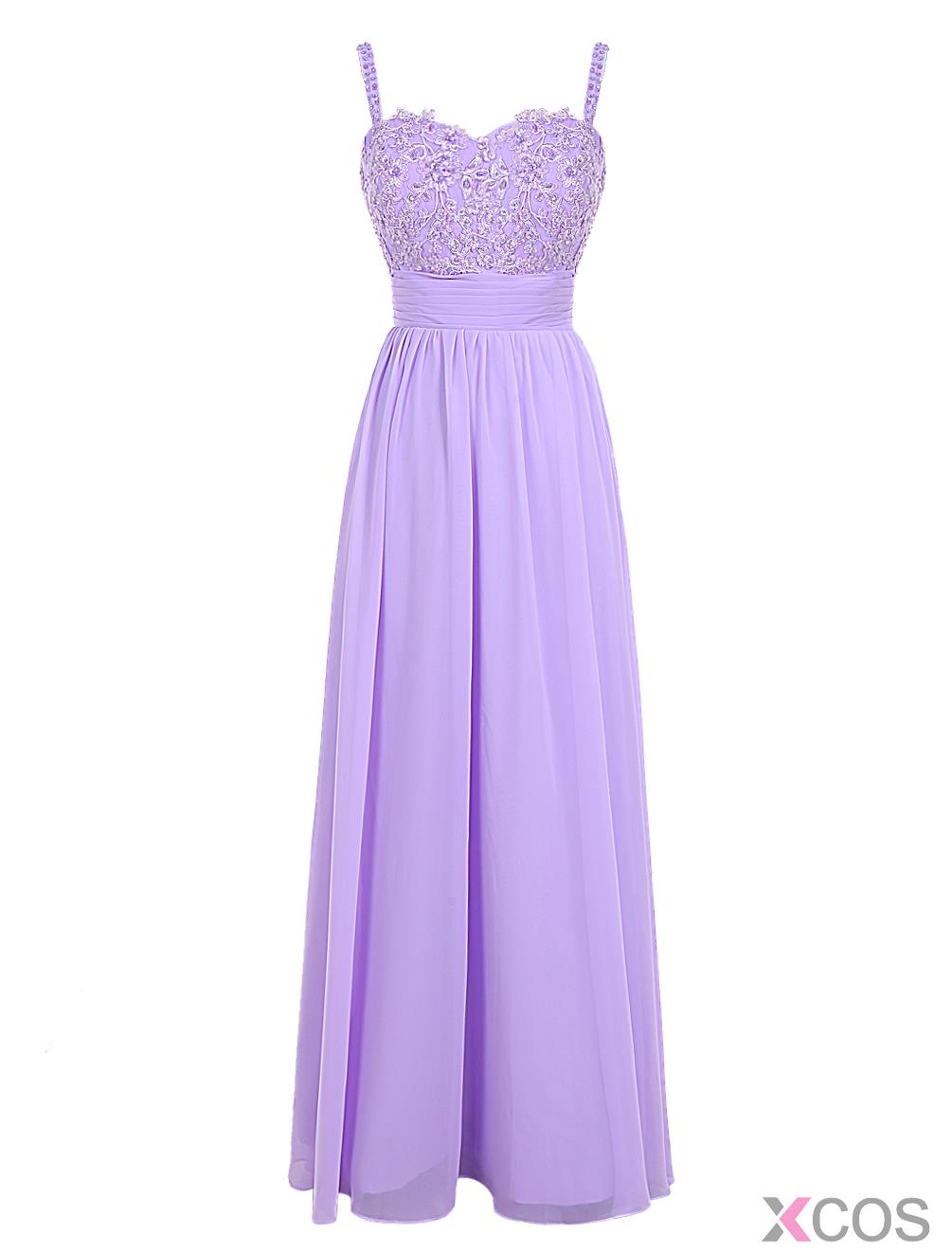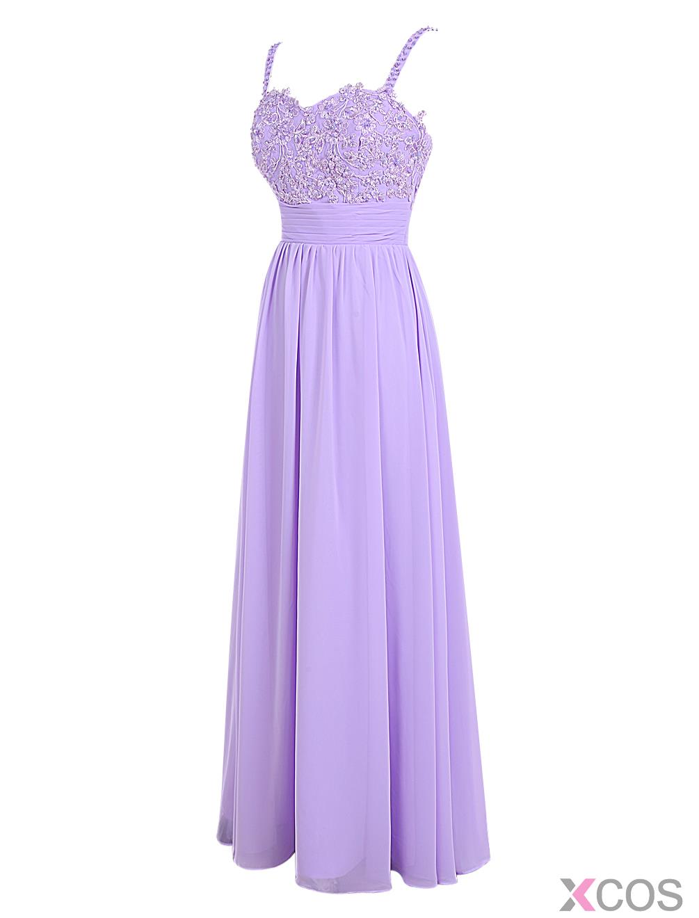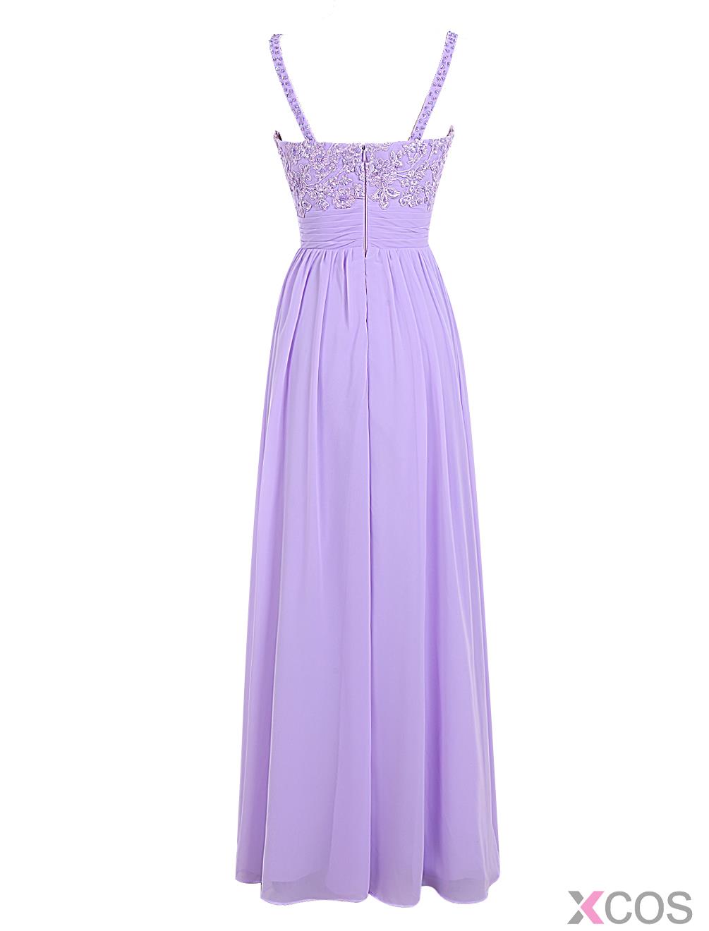 • Elegant A-line Spaghetti Straps Chiffon Sleeveless Long Lilac Prom Dress With Appliques
