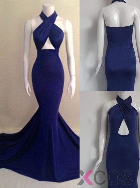 Elegant Mermaid Halter Court Train Royal Blue Long Prom Dress Evening Gowns With Ruched