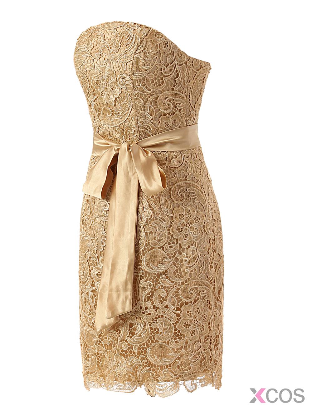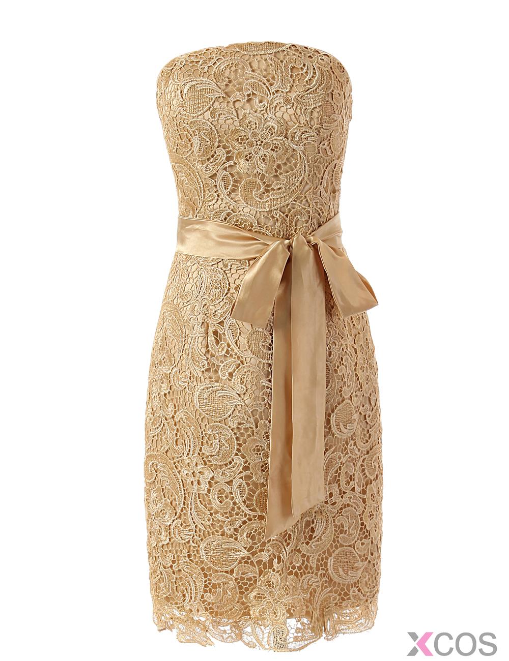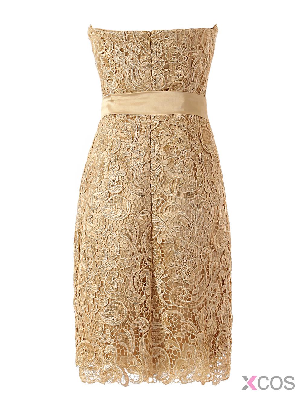 • Elegant Strapless Champagne Lace Short Bridesmaid Dress