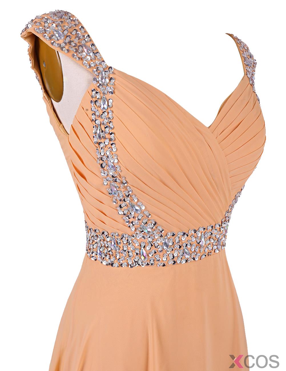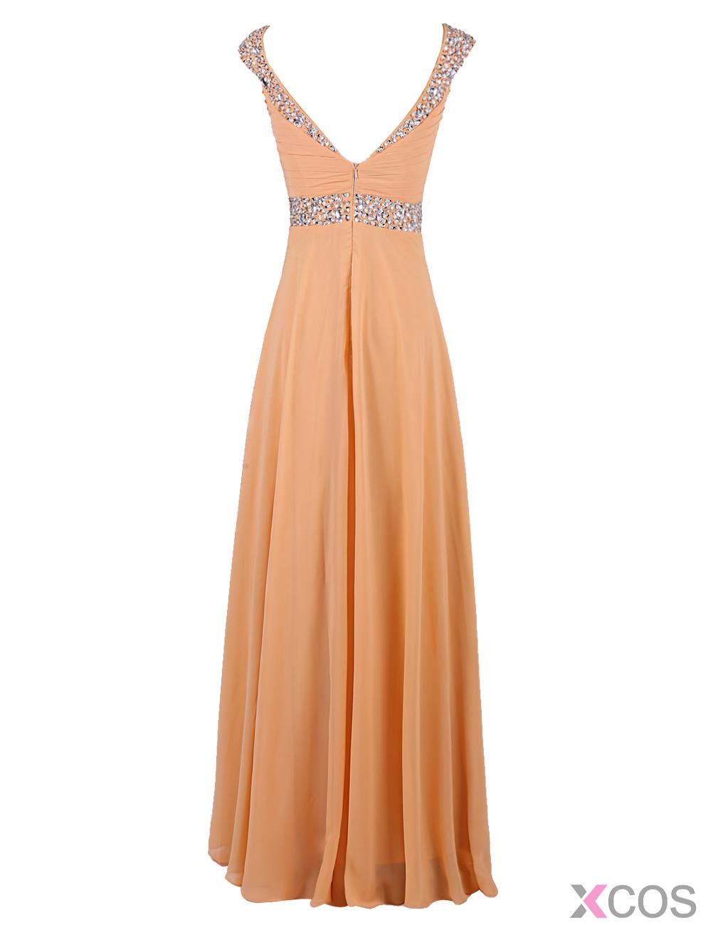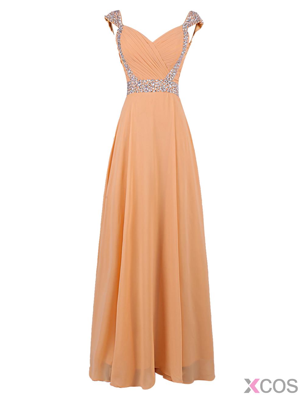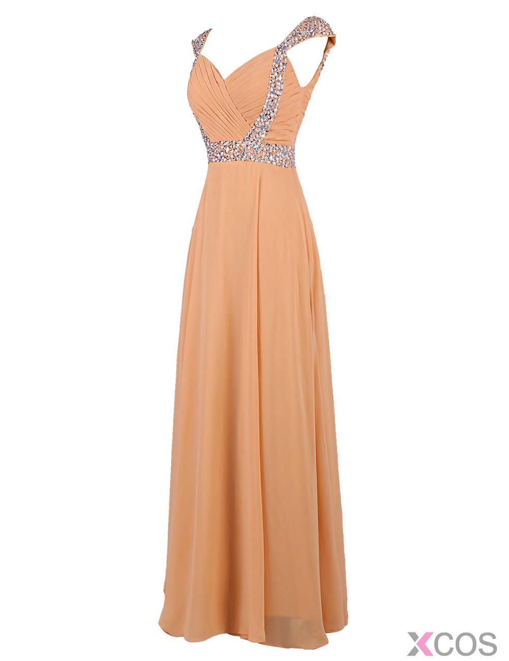 • Fashion V-neck Beading Cap Sleeves Long Champagne Prom Dress