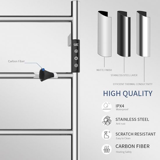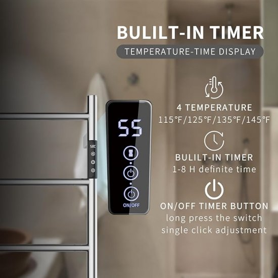 Brand: Forsure Product Dimensions: 28.97 x 18.7 x 3 inches Item Weight: 7.24 pounds Material: Stainless Steel Fast Heating & Overheat Protection: ① it will heat up in 5 minutes and reach the optimal temperature of 122-140℉ (50-60℃) within 20 minutes. The towel rack has a built-in overheating protection function, which will not overheat the heating rod and burn you or cause the towel to be scalded.②1-8 hours timing,The length can be within your control of use.which also greatly increases the energy saving and environmental protection. Material & IPX5 Waterproof: ① towel warmer is made of durable 304 stainless steel with Brushed finished and easy to clean. ② Our professional team pursues high quality, but also pursues a higher aesthetic appearance, precise mold opening, seamless splicing, and rejects the ugly state created by welding.Its modern style makes it suitable for your home, hotel, spa and pool etc. Energy-saving electric towel rack: ① Forsure towel warmer has a very low consumption rate and is designed to run 24 hours a day. Use electricity to produce zero pollution and an economic 70W heat output costs less, an affordable alternative to traditional dryers. ② Towel warmers are very lightweight, so there is no requirement for wall bearing and no pressure on the wall. It's wall mounted design saves space, not only a perfect towel heater, but also a wonderful decoration. Hardwired, Plug-In & 2 Options: ①This towel warmer can either be hardwired or plugged into a wall socket (standard electrical outlet at rated voltage of AC 120V/60Hz). ② All necessary hardware and tools are included in the packaging, and it is easily assembled using our manual. A Warm and Sweet Gift: This Electric heated towel rack is a well thought-out gift for housewarming, wedding, shower or birthday, anniversary and mother's day etc. Perfect Accessory for Home, Pool House, Shower, Salon, Hotel, Spa, Massage, Baby Care, Elders and people getting bed bath & More. Once you have experienced the comfort of a warm towel, that will become your daily pleasant surprise after a bath. Pamper your friends & family with this incredible present!