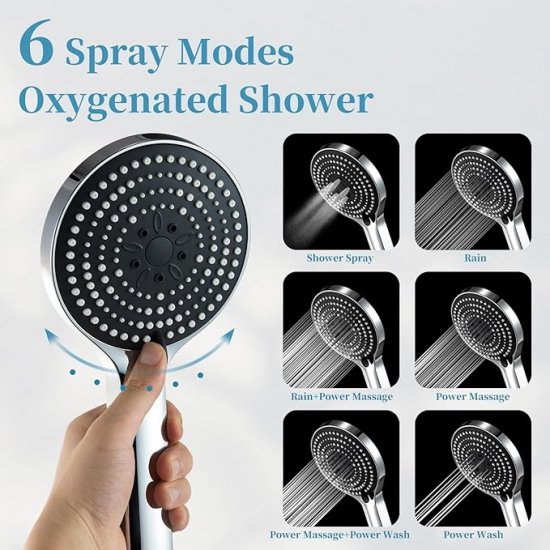 6 Spray Mode Shower head: The 5 inch diameter handheld shower head includes 6 spray modes: oxygenated shower spray, rain, rain+massage, massage, massage+power wash, power wash. After a tiring day, you can choose the massage mode to let you relax with a hot shower. Easily changed the modes by the button.
