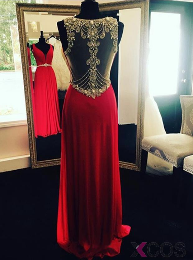 Glamorous Sheath V-Neck Floor Length Red Prom Dress/Evening Dress with Beading