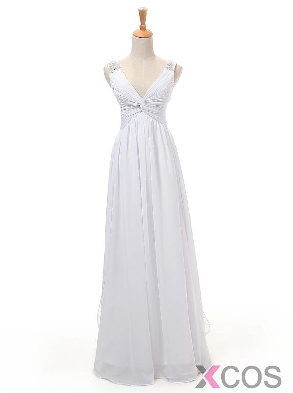 Hot Selling A-line V-neck Floor Length White Bridesmaid Dress With Beading Bridesmaid Dresses CHDT100045