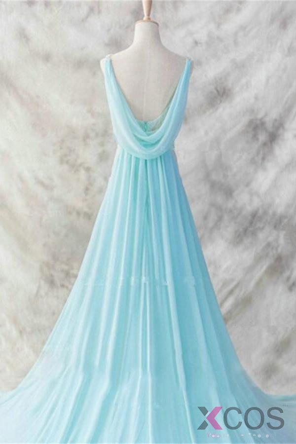 Ice Blue Simple Deep V-neck Beaded Open Back Prom Dresses OK22