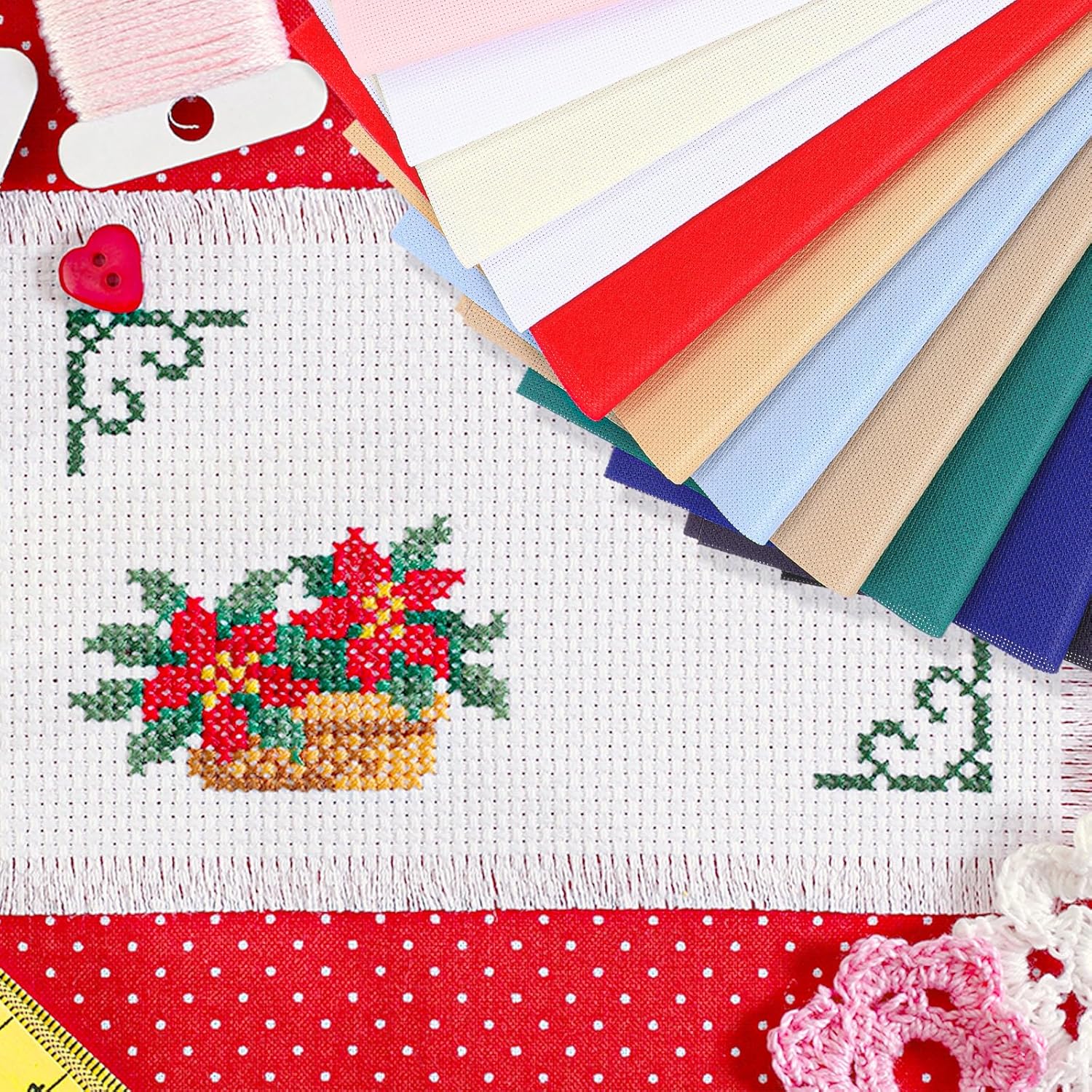Brand: InMemory Color: 12 commonly colors Material: Cotton Size: 11.8 x 17.7 inch Count: 14 Count Generous Package Quantity: one package includes 12 pieces aida cloth; With this generous quantity, you can freely extend your imagination on various embroidery projects, from practice works to creating an intricate cross stitch masterpiece. Quality Material: our aida cloth is made from 100% pure cotton, offering smooth surface, clear texture, and not easy to fade; It is suitable for DIY projects such as hand embroidery and clothing making. Fabric Size: each aida cloth measures 11.8 x 17.7 inch, providing ample space for most embroidery and cross stitch projects; You can also cut it into the required size according to your needs. Easy to Use: the product specification is 14 Count, that is, there are 14 grids in one inch, and there are small holes in the four corners of the grid, which is convenient for sewing and embroidery. Vibrant Multicolor Availability: the product colors include 12 commonly colors , with various colors to meet the needs of daily DIY use