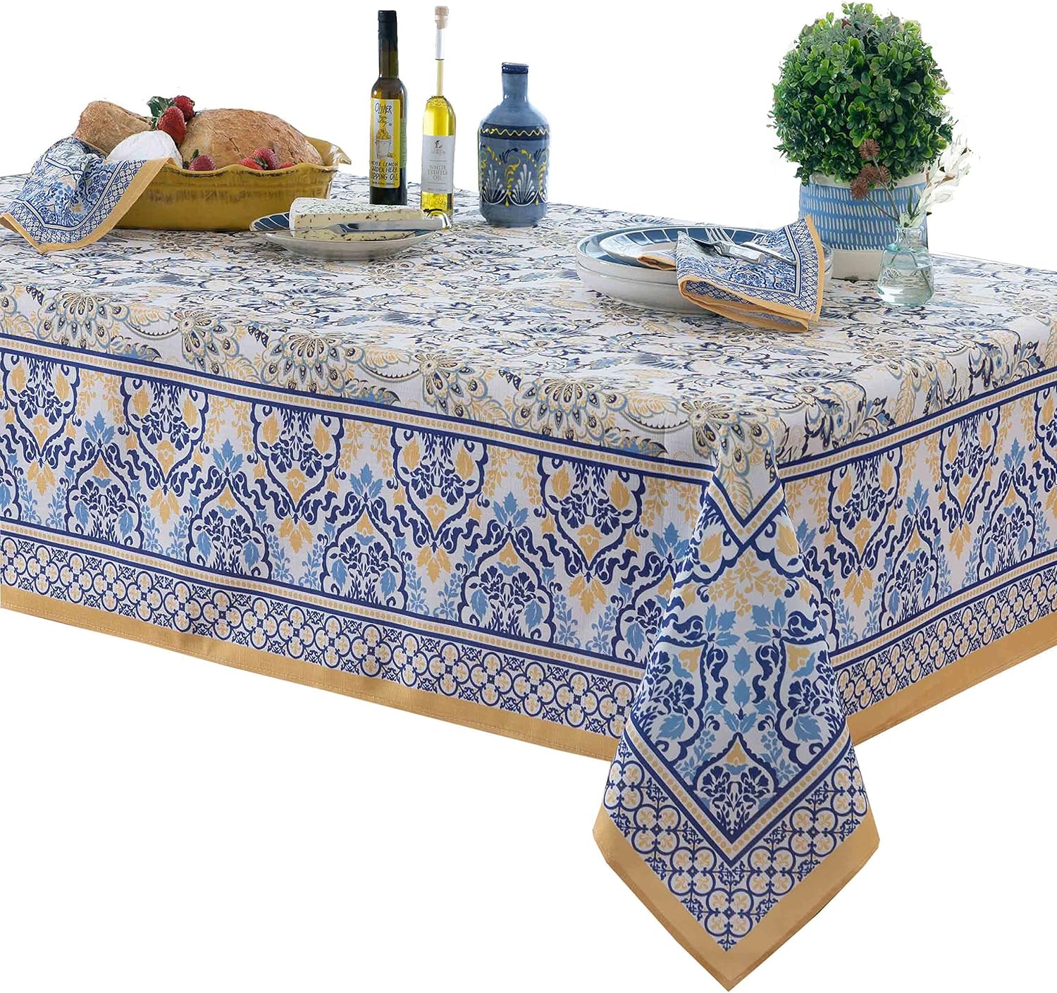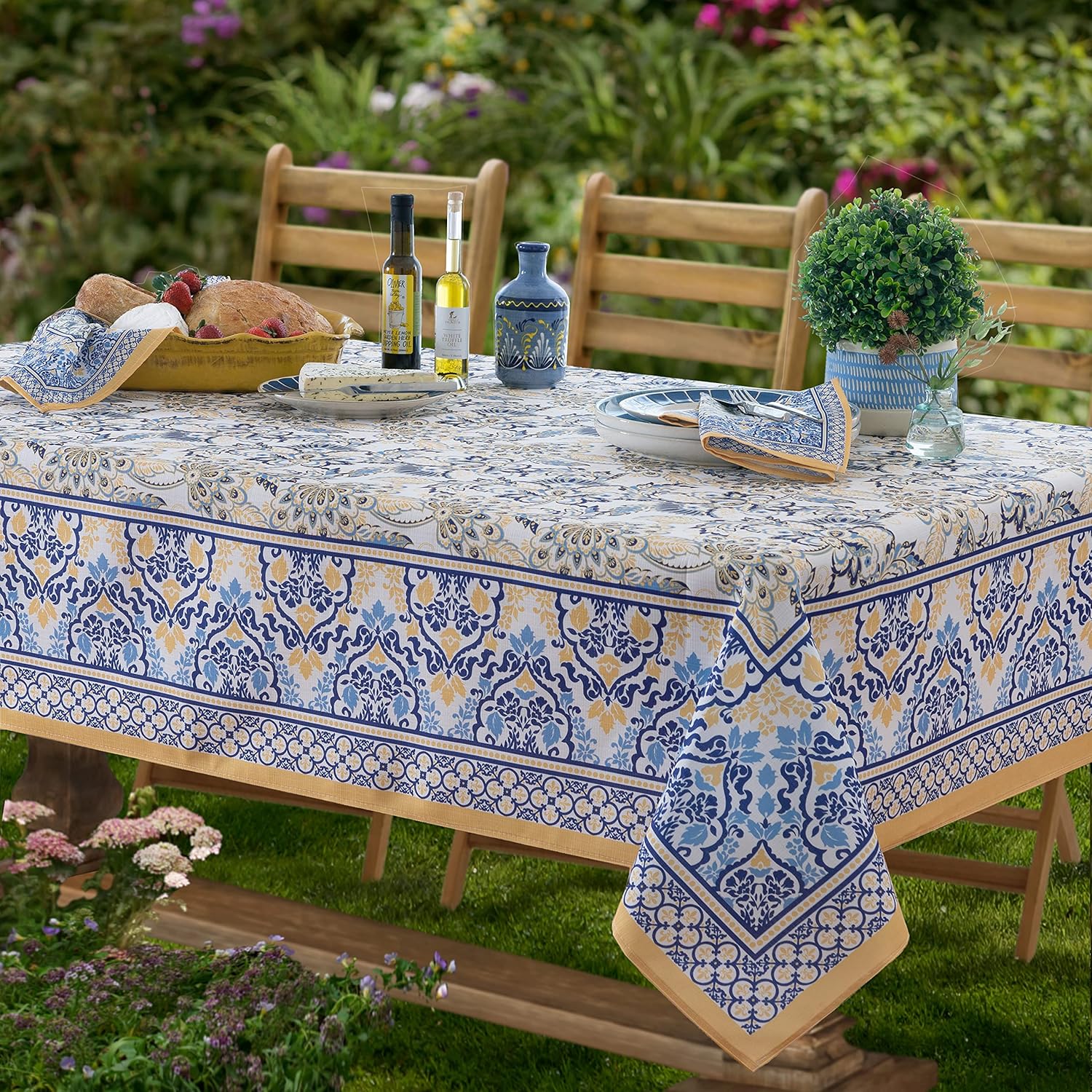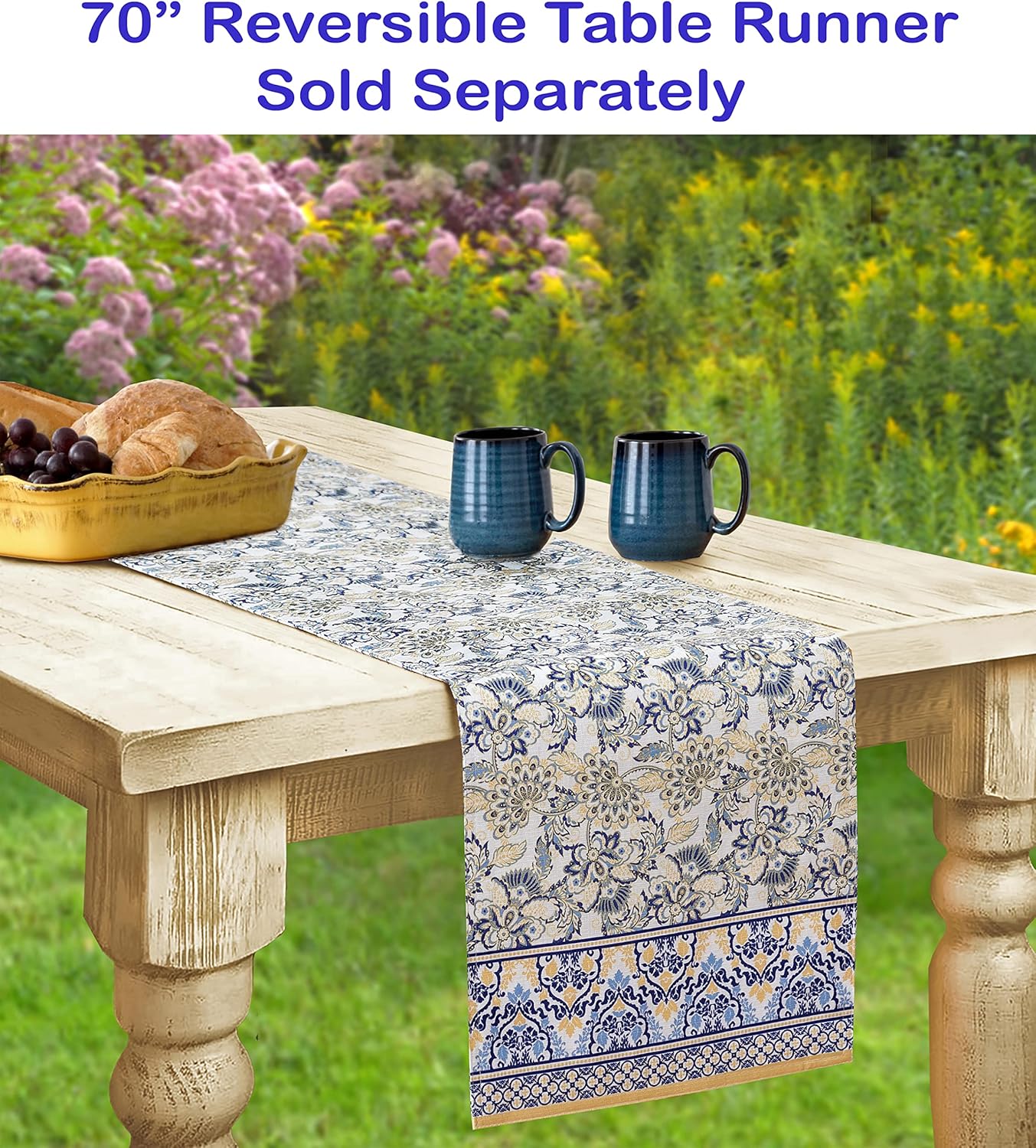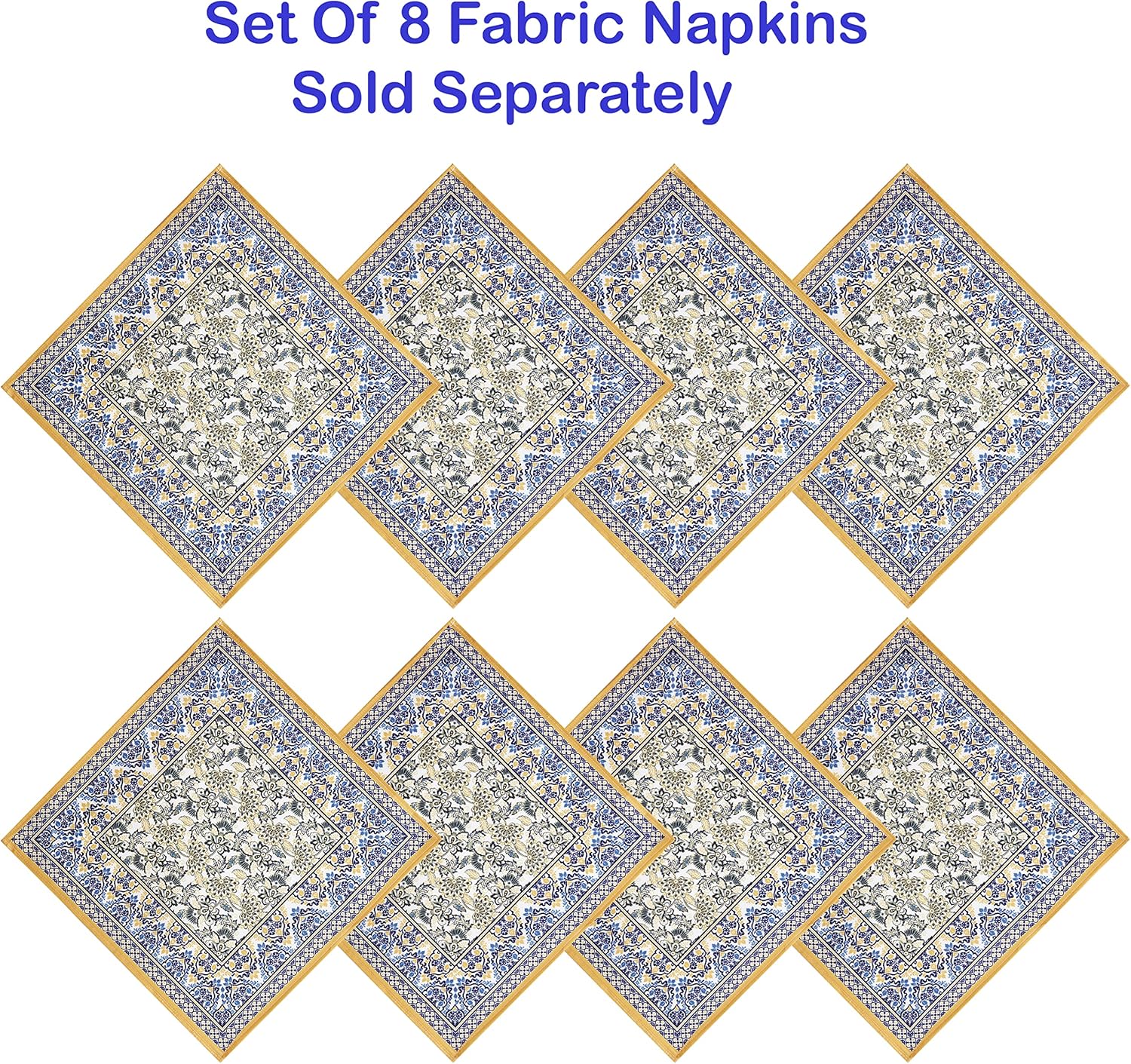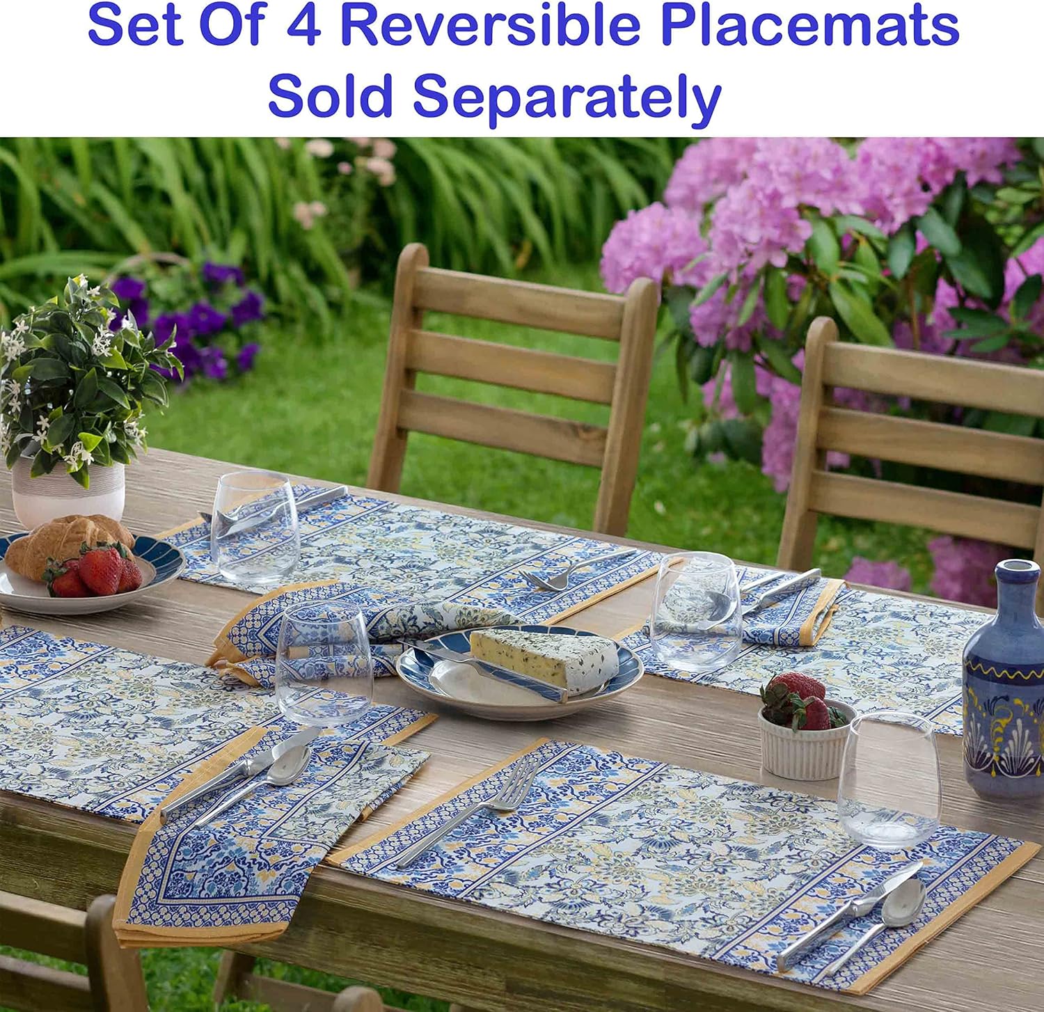 Brand: InMemory Size: 19"L x 13"W Set of 4 Color: Yellow and Blue Floral Material: Fabric Easy Care 100% Polyester, Stain and Water Resistant, Wrinkle Free Fabric Tablecloth Provence Allure Arabesque Yellow and Blue Floral Bordered Country French Fabric Tablecloth Collection by InMemory, Indoor Outdoor, Stain and Water Resistant Set of 4 Placemats. Set of 4 Bordered Print Fabric Placemats - 13" x 19" Styling: The Provence Allure Arabesque Yellow and Blue Floral Bordered Country French Fabric Tablecloth by InMemory is indoor and outdoor, stain resistant, water resistant, and wrinkle free. This beautiful floral comprised of arabesque flowers and shapes features rich blue motifs accented with bold yellow on fully engineered borders of yellow and blue bands on a white background. Features: Easy Care Indoor and Outdoor Tablecloths for Kitchen, Dining Room, Patio, Barbeques, Picnics and Restaurants. Perfect for Spring, Summer and Year Round Dining Entertaining, and Decorating. 100% Polyester Easy Care, No Iron, Stain Resistant fabric CARE INSTRUCTIONS: Easy Care advanced 100% polyester construction is machine washable in cool or warm water - no bleach. Tumble dry at lowest setting and requires little or no ironing. Wash dark colors separately.