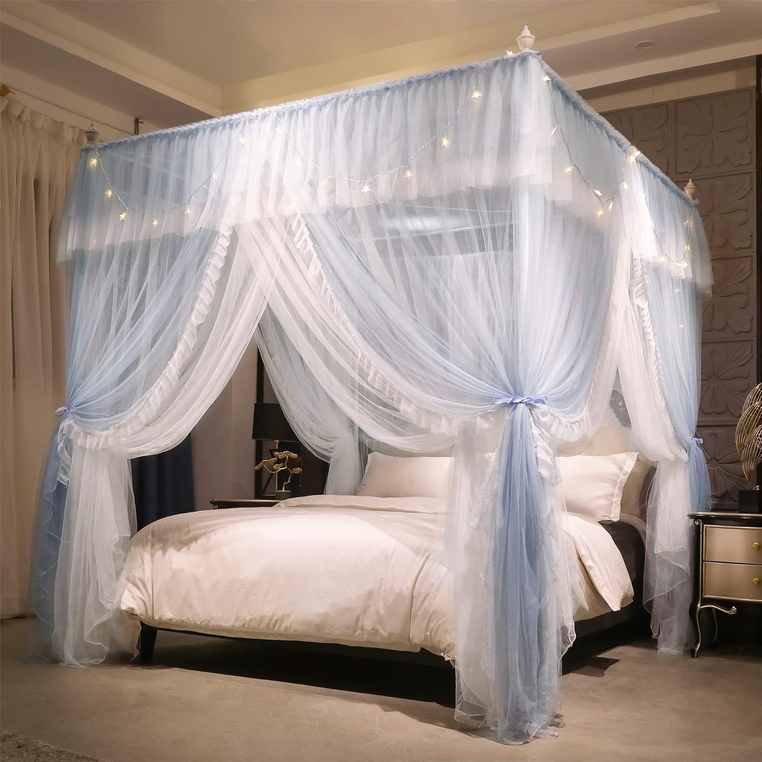 Fashionable Design--The ruffle design at the top makes your room romantic and elegant,Clever 4 openings double bed curtain design makes your bed full of romantic atmosphere. Realize every lady's fantasy of the princess.Practical and beautiful,making your bed canopy full of Princess flavor. Please note (The lights and poles in the picture are not included).
