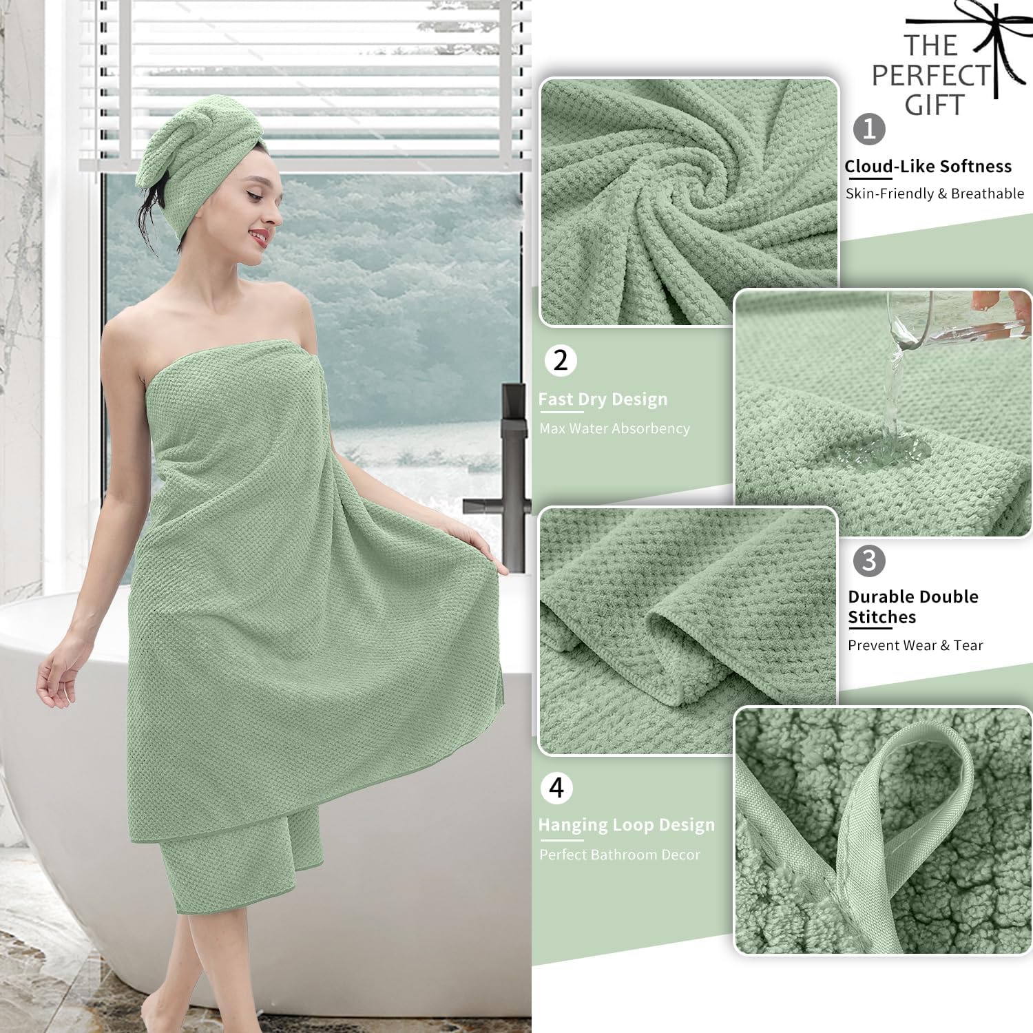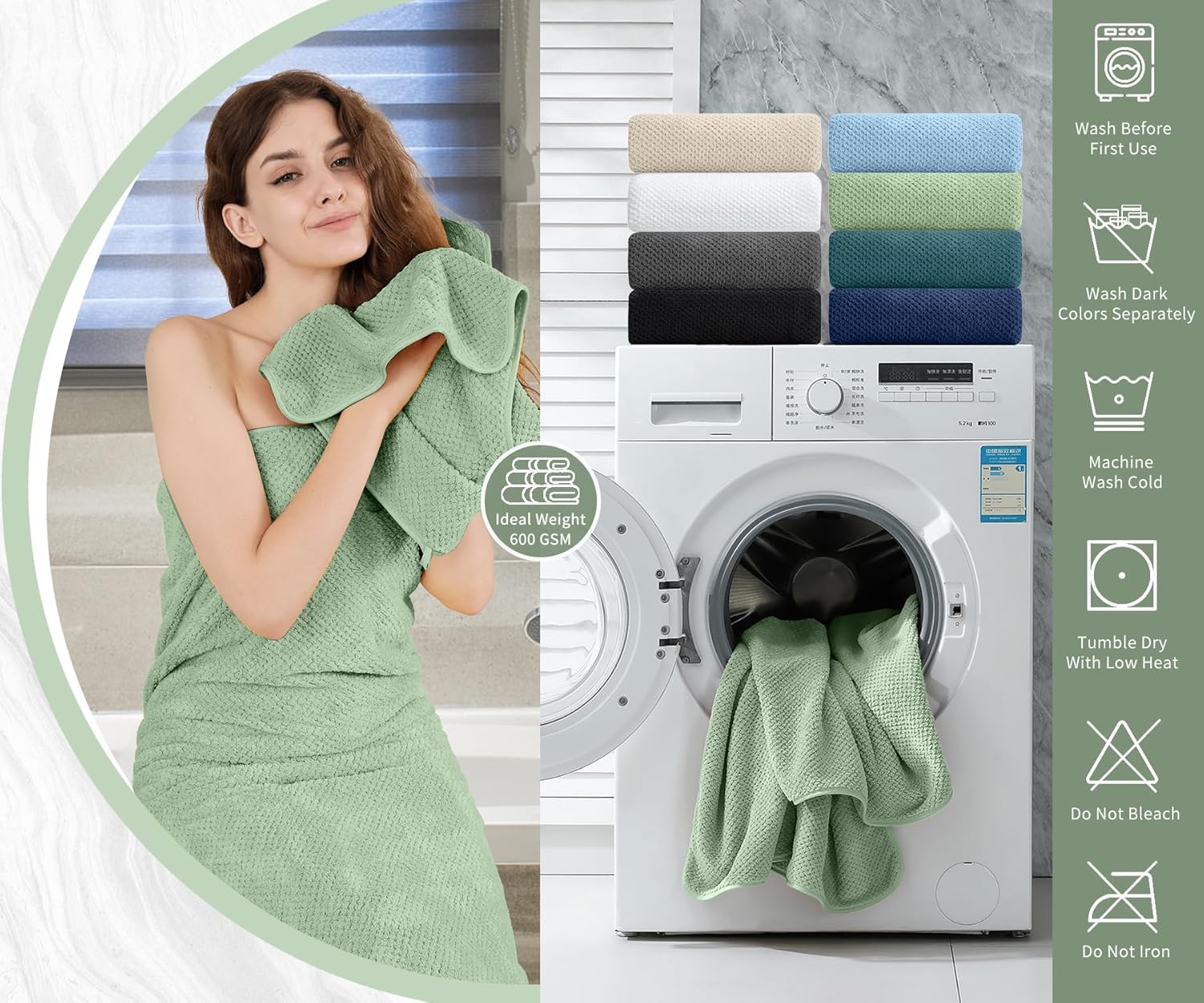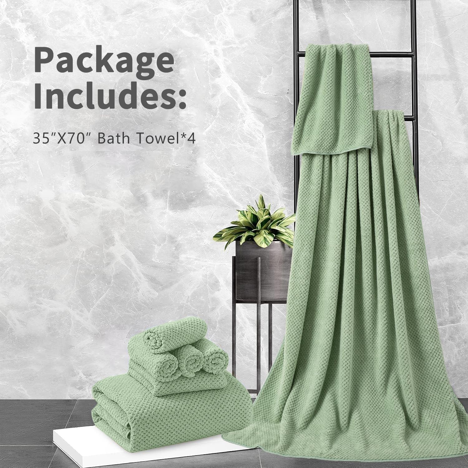Brand: InMemory Color: Texture Green Material: Microfiber Product Dimensions: 70"L x 35"W JUMBO OVERSIZED BATH SHEET: 4 Piece Extra Large Bath Sheet size are 35x70 inches. oversized bath towels Can completely wrap your body,The naturally soft, breathable, and comfortable material of towel sets provides you a pleasing experience after bathing,you will enjoy the experience of softness,moisture absorption, luxury, lightness. The premium quality of luxury bath towels provides long-lasting strength and can be used for a longer period of time. HIGH QUALITY WATER ABSORPTION BATH SHEET: Premium bath towels,feel soft and cozy,bathroom towels have high water absorption and fluffy,towels very suitable for hands and body,Soft bath towels giving you a comfy experience after bathing, and bath towels can quickly absorb the moisture on your body,high quality microfiber bath towel ensure optimum softness, fluffiness and wonderful absorbency. MULTIPURPOSE TOWEL SET: Large bath towel sets can be used perfectly for various purposes including bathroom, hotel,beach,gyms,shower rooms,swimming pools, spas,hotels,salon, and as college dorm room essentials.These bathroom towels provide users with all the required bathroom drying needs either to dry your body or warp around your hair. SOFT TOUCH AND DURABLE: bath towel edges with professional hemmed seaming finish,towels have a reinforced double stitched hem,designed to prevent fraying and tearing. Your towel will be durable and maintain its best condition,The towel is soft and delicate, which is very suitable for people with sensitive skin. The soft looped cloth will not harm your skin. CARE INSTRUCTIONS: wash before use,Machine wash in cold,Tumble dry low,Do not iron,towels can absorb 10 times their weight in water makes quick drying large surface ,This towel can be washed and reused hundred of times which remain soft after multiple wash and dry cycles.