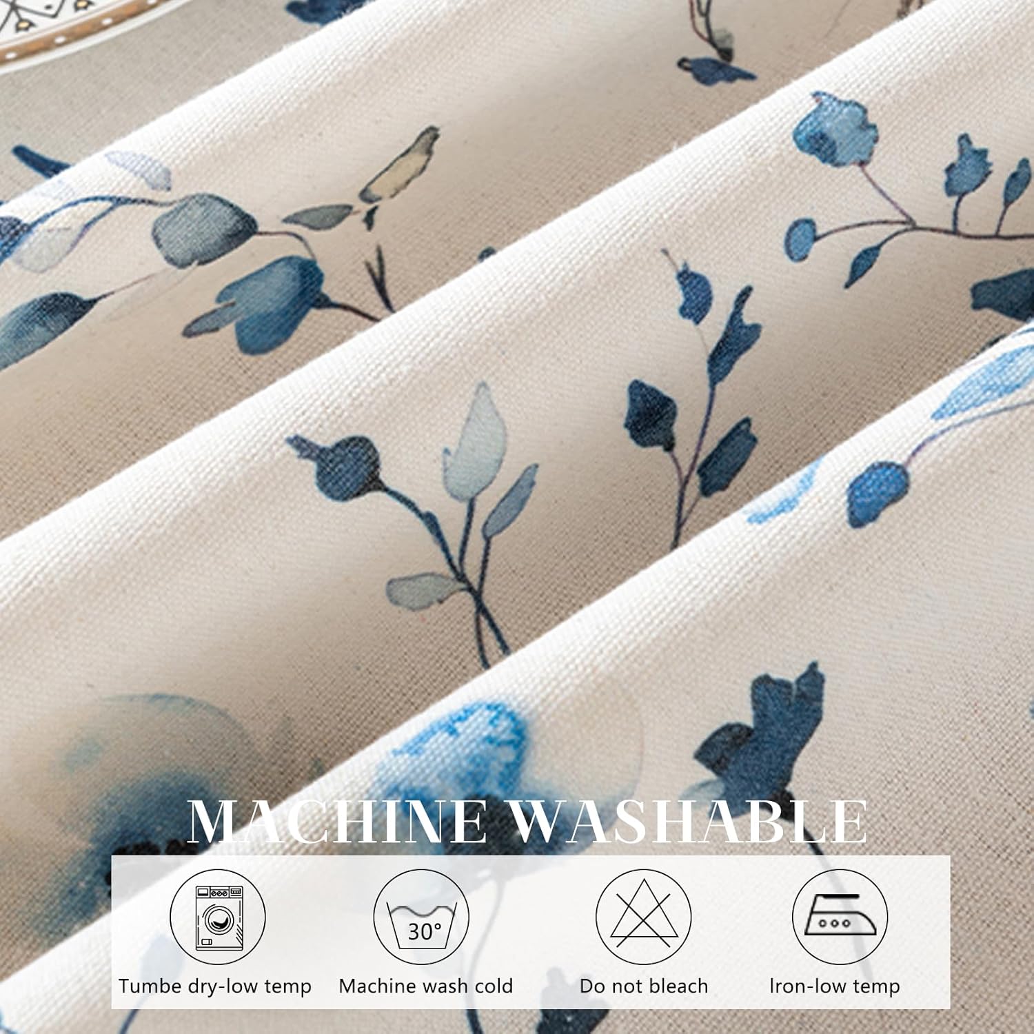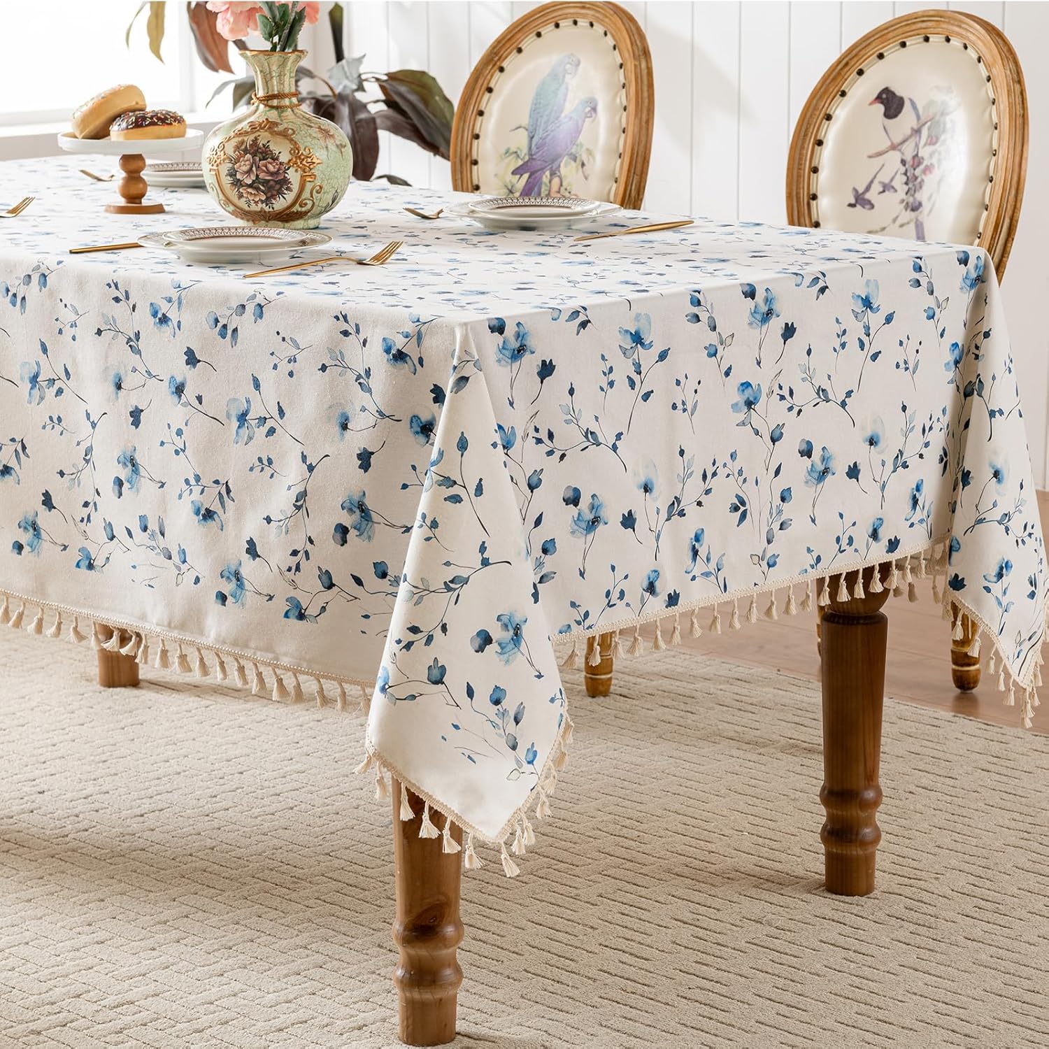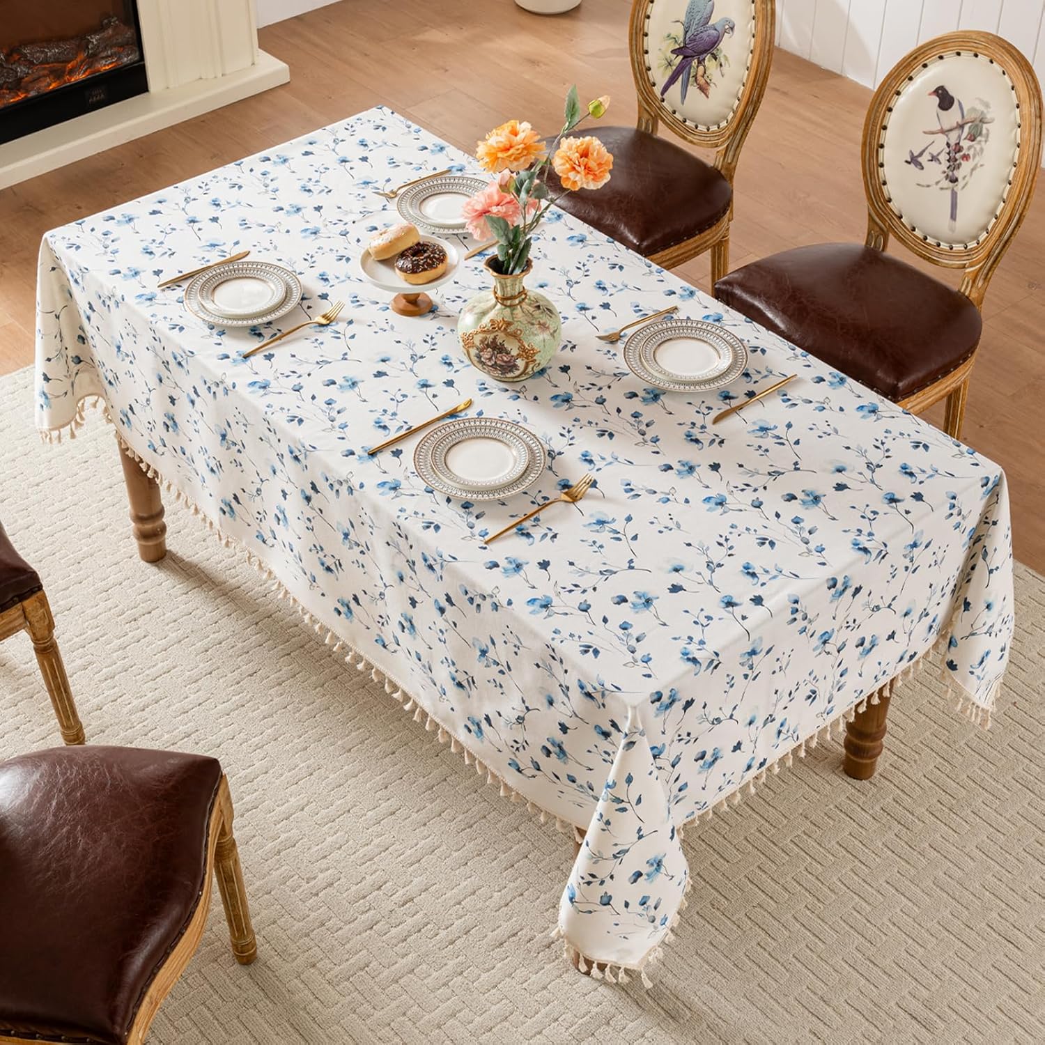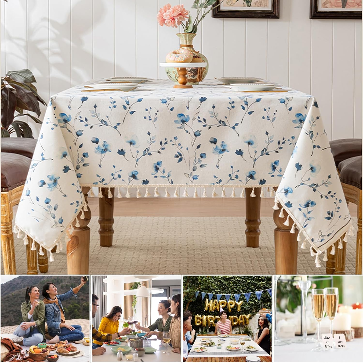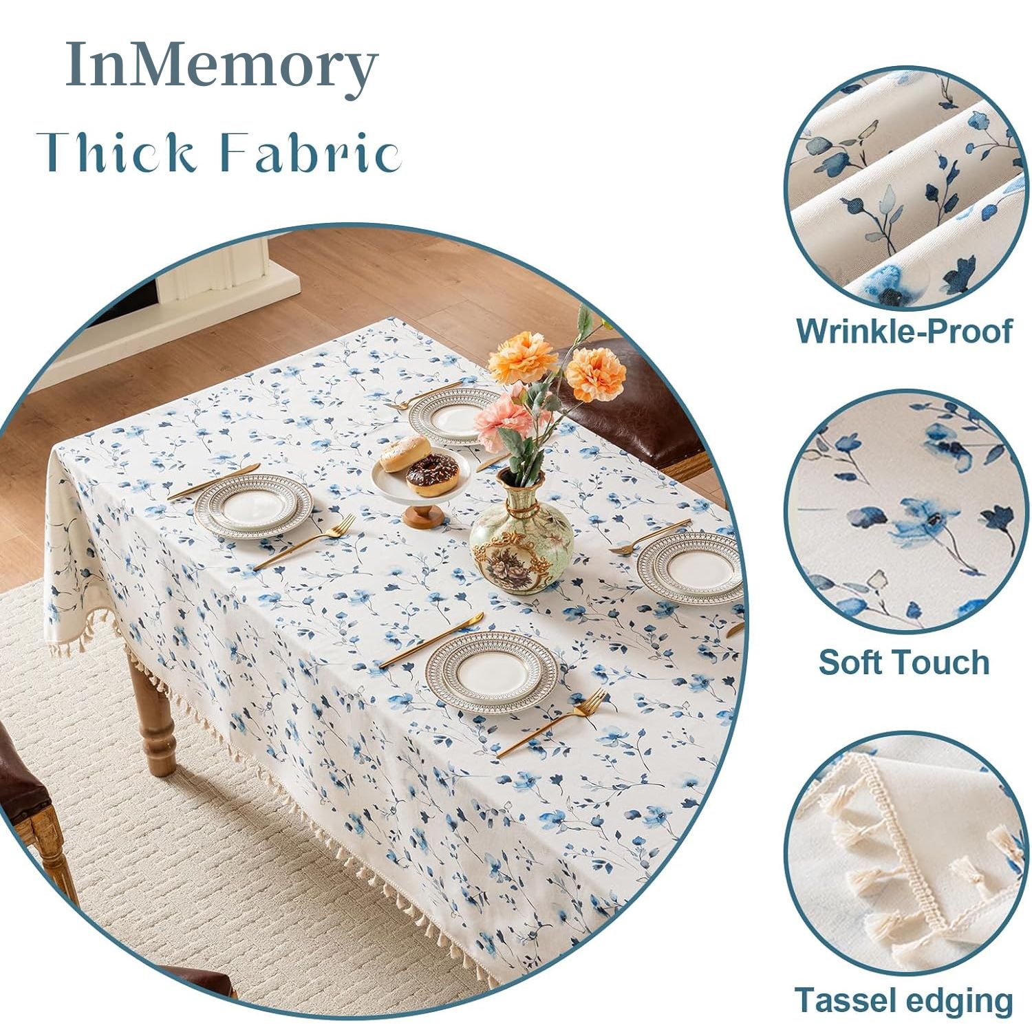 Brand: InMemory Color: White with Blue Flower Material: Fabric Size: 72"L x 55"W ( Customized sizes available ) Rustic Rural Style Design – Bring a warm, cozy farmhouse charm to your dining room, kitchen, or patio. Perfect for creating a natural countryside atmosphere for everyday meals or festive gatherings. Waterproof & Spill-Proof – Specially coated fabric repels water, oil, and stains. Protects your table from accidental spills while keeping cleanup fast and stress-free. Durable & Wrinkle-Free – Made with high-quality polyester fabric that is wear-resistant, fade-resistant, and wrinkle-free, ensuring long-lasting beauty and practicality. Versatile for Any Occasion – Ideal for dining tables, coffee tables, buffets, picnics, BBQs, farmhouse decor, and outdoor parties. Suitable for both indoor and outdoor use. Easy Care & Maintenance – Wipe clean with a damp cloth for daily use, or machine wash gently for a deeper clean. Dries quickly and keeps its shape, making it convenient for busy households