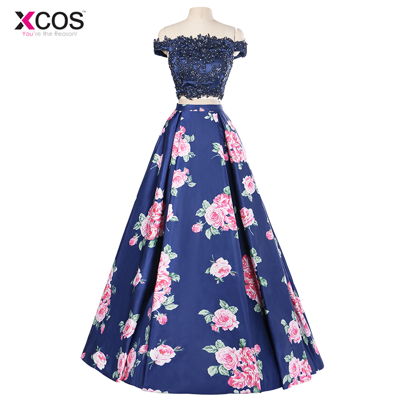 Navy Blue Off Shoulder Two Piece Prom Dresses Long Floral Print 2018 Lace Applique Special Occasion Formal Beaded Evening Gown