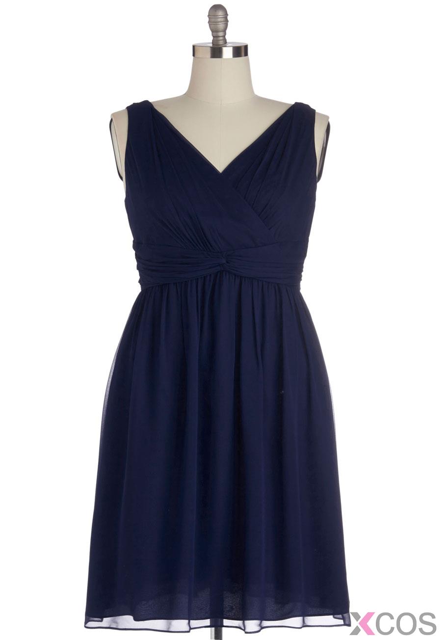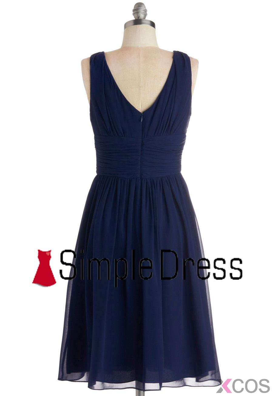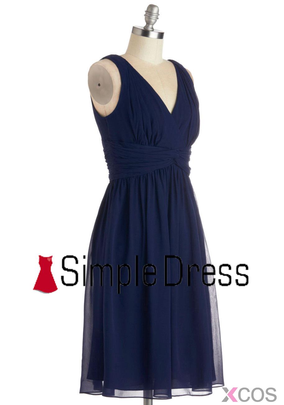 Navy Blue V Neck Short Knee Length A Line Chiffon Bridesmaid Dress CHBD-80068