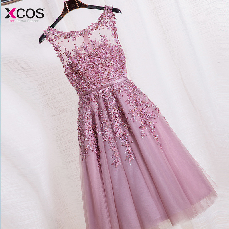 Pink Beaded Lace Appliques Short Prom Dresses 2016 Robe De Soiree Custom Made Knee Length Party Evening Dress