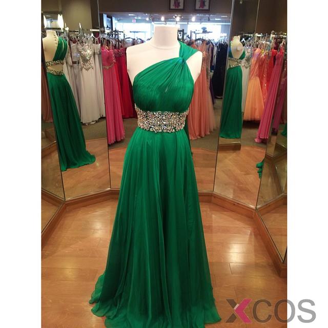 Princess Chiffon Prom Dress - Emerald Green One-shoulder Empire Stones