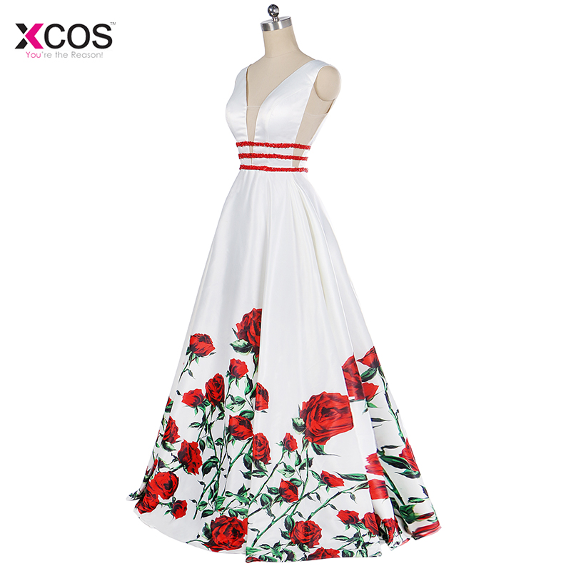 Printed Floral Satin Evening Dresses Long V-Neck Beading Prom Dress Floor Length A Line Formal Special Occasion Party Gown