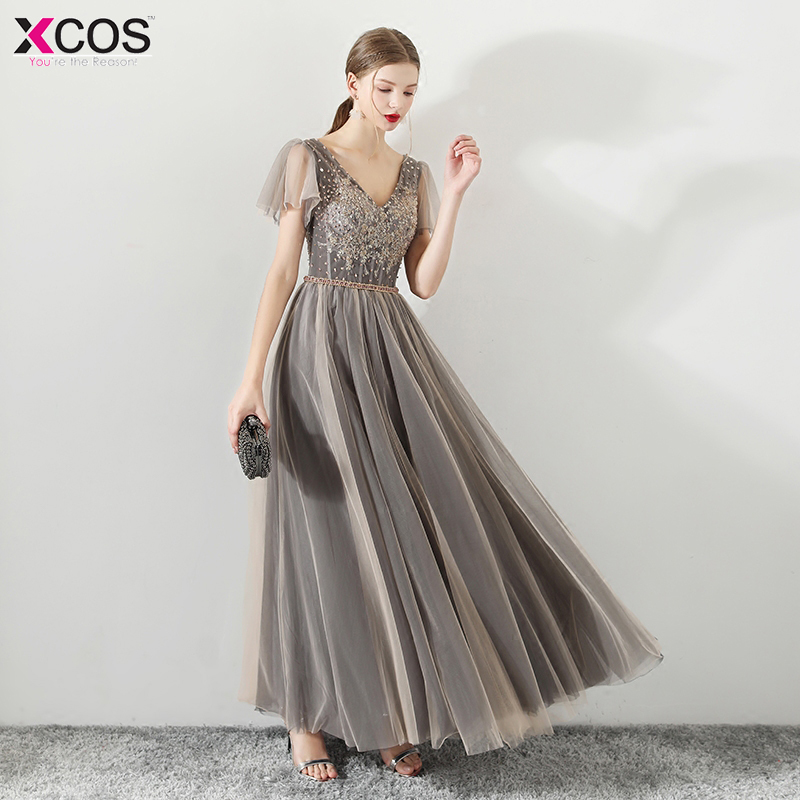 Robe De Soiree Sweet Grey Tulle V-neck Beaded Sequins Long Evening Dress The Bride Party Sexy Backless Prom Dresses 2018