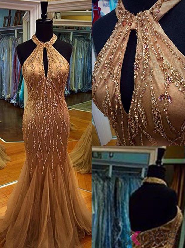 • Sexy Prom Dress -Mermaid Halter Neck Sleeveless Beading with Keyhole