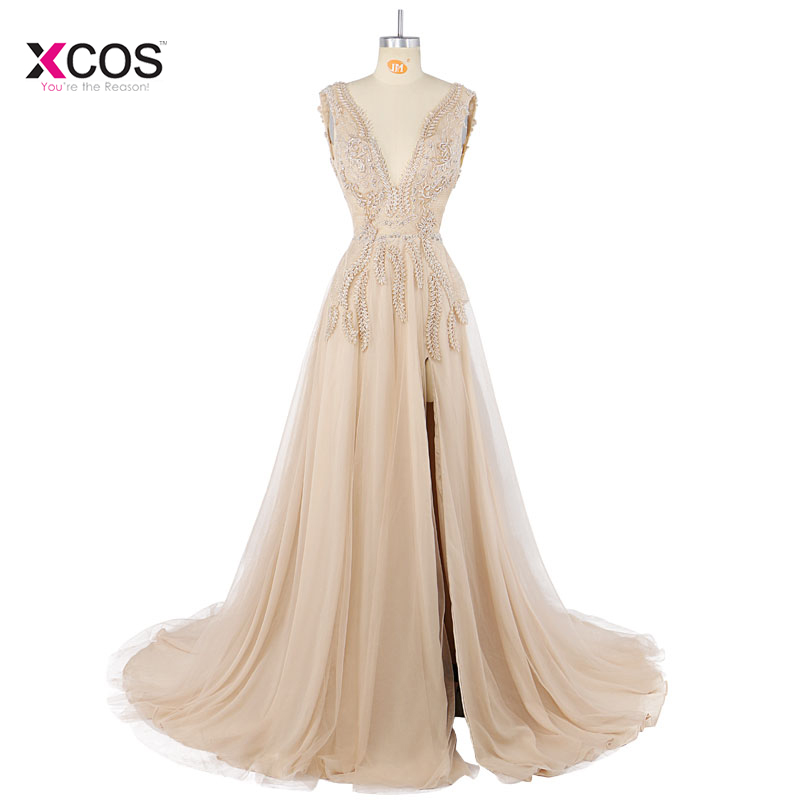 Sexy Side Split Prom Dresses 2018 Deep V Neck Backless Beads Crystal Party Gowns Sleeveless Court Train Cheap Tulle Party Dress