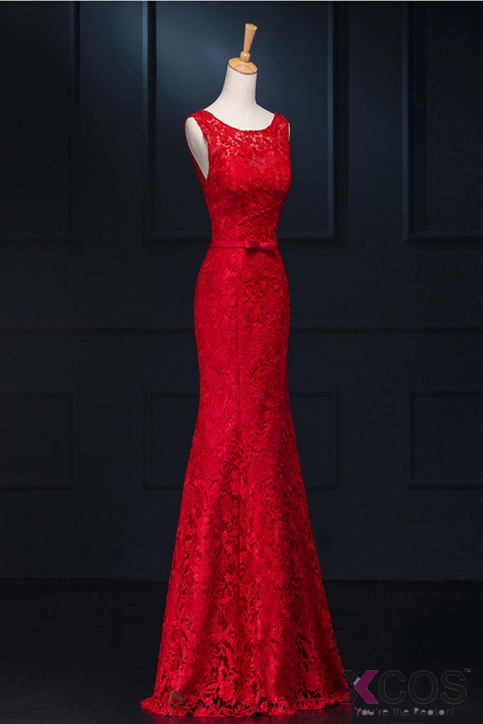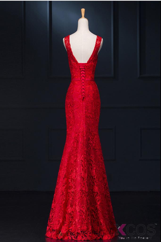 • Sheath Real Sexy Red Lace Long Mermaid Backless Prom Evening Dresses ED0713