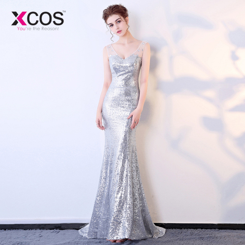 Silver Sequin Evening Dresses New Arrival Mermaid Sexy Prom Dress Party Long Vestido De Festa Robe De Soiree Longue 2018