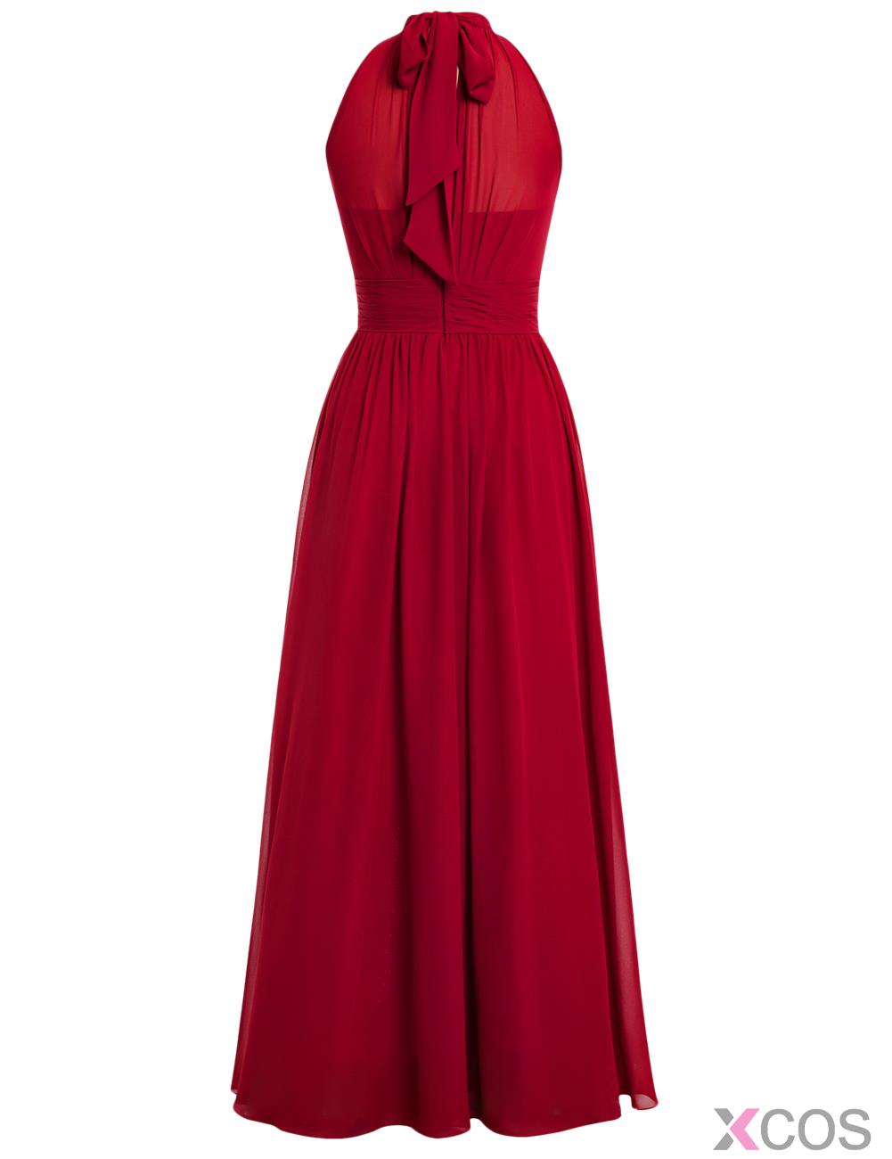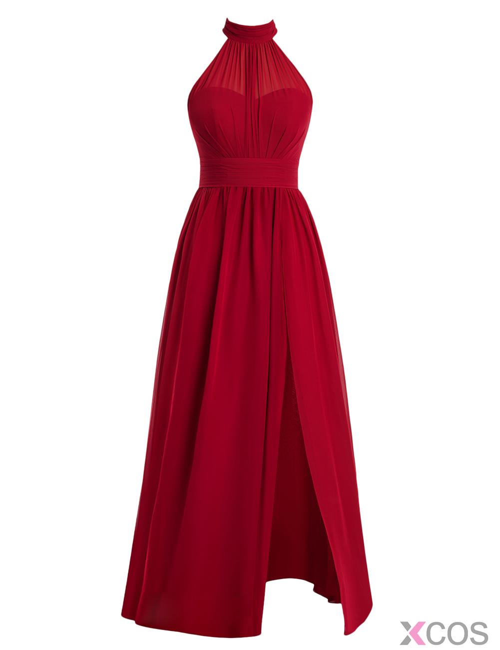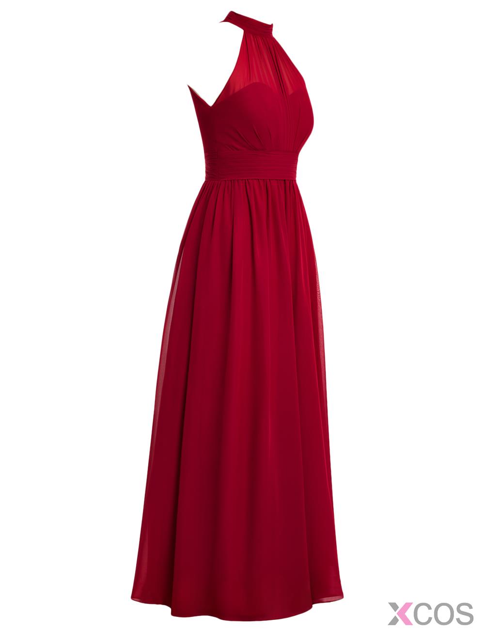 • Simple A-line High Neck Chiffon Sleeveless Ruffles Red Prom Dress Evening Gowns