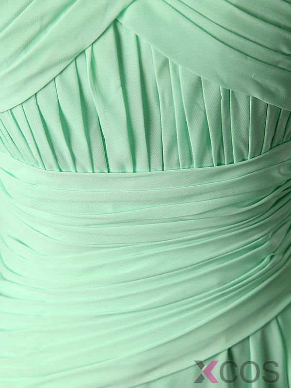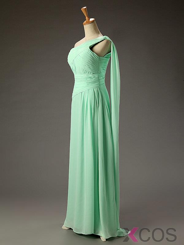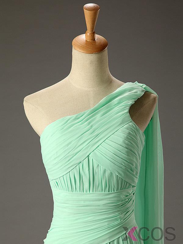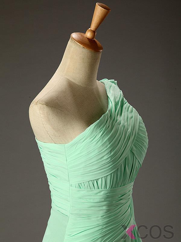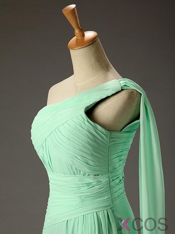 • Simple A-line One Shoulder Chiffon Empire Long Mint Backless Prom Dress With Ruffles