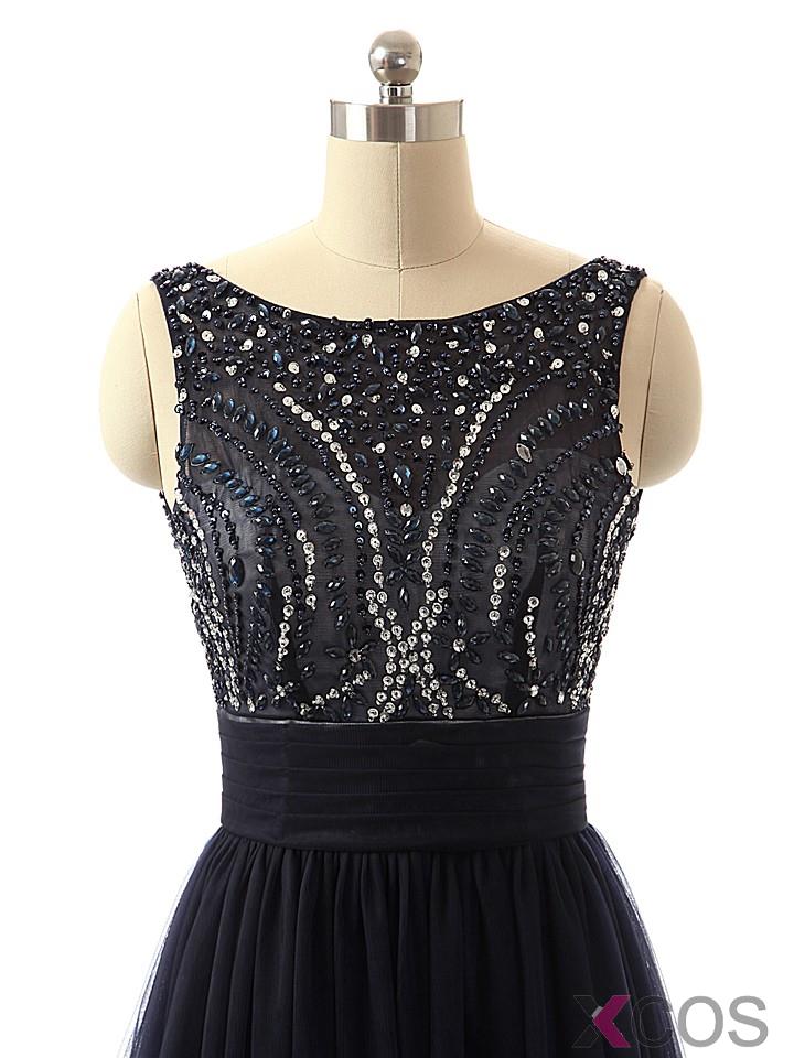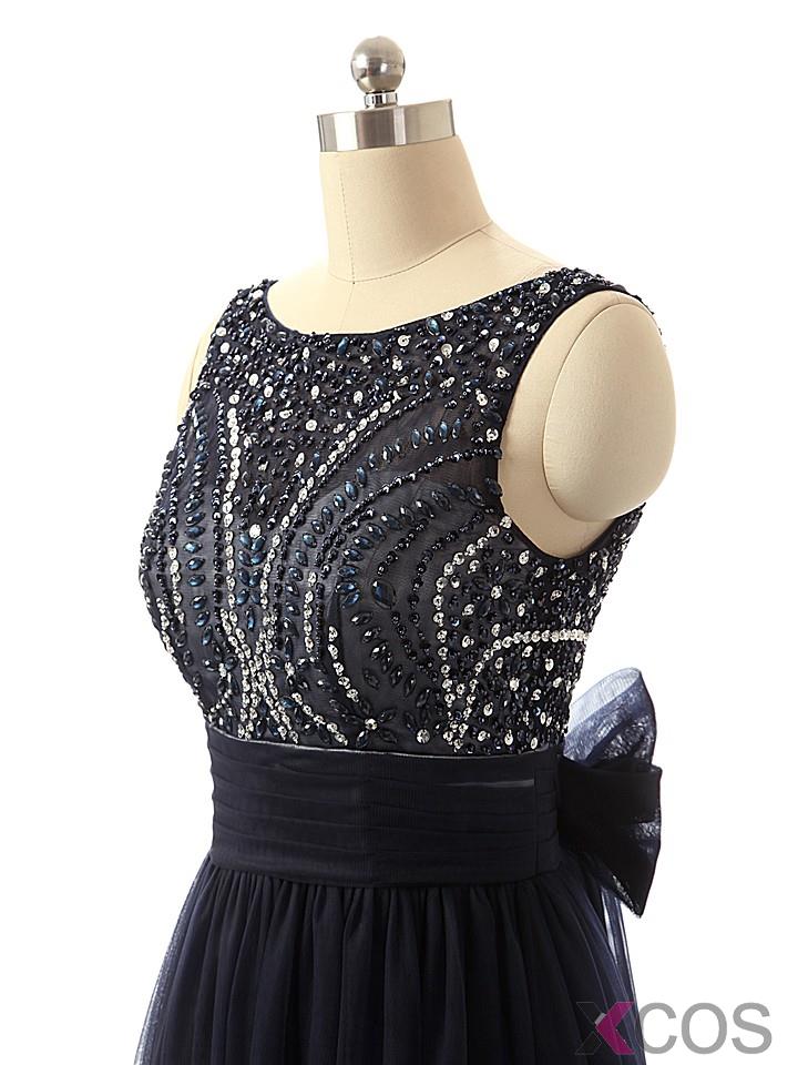 Simple Dress Elegant Beading Scoop Open-back Ribbon Black Long Tulle Prom Dresses, Evening Dresses TUPD-7120