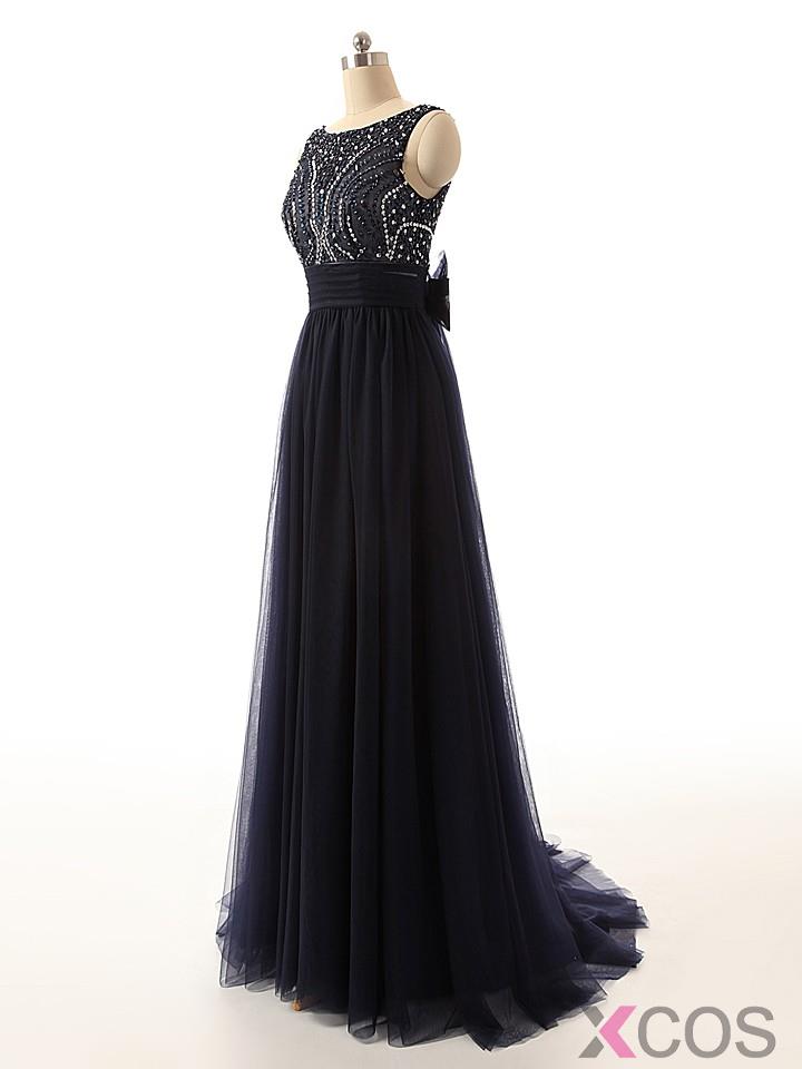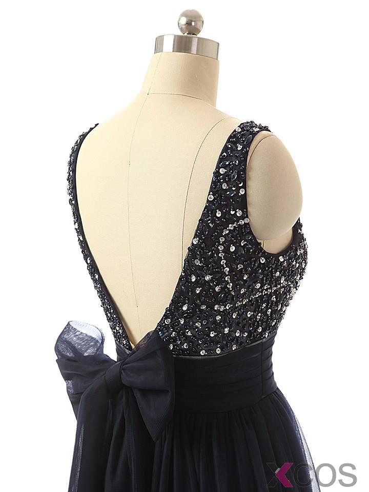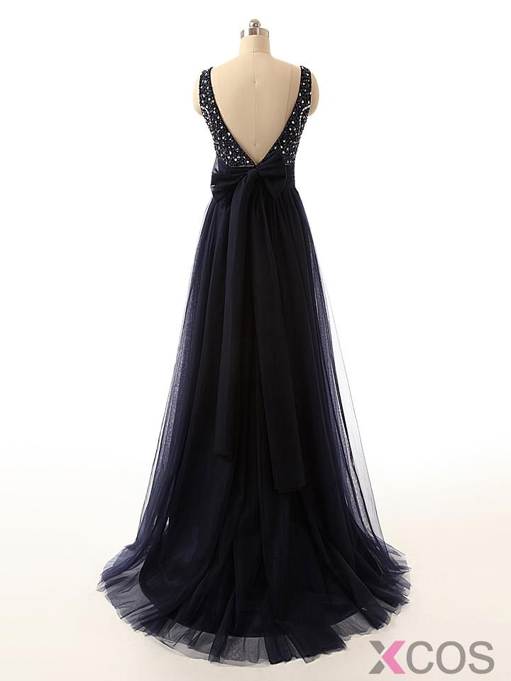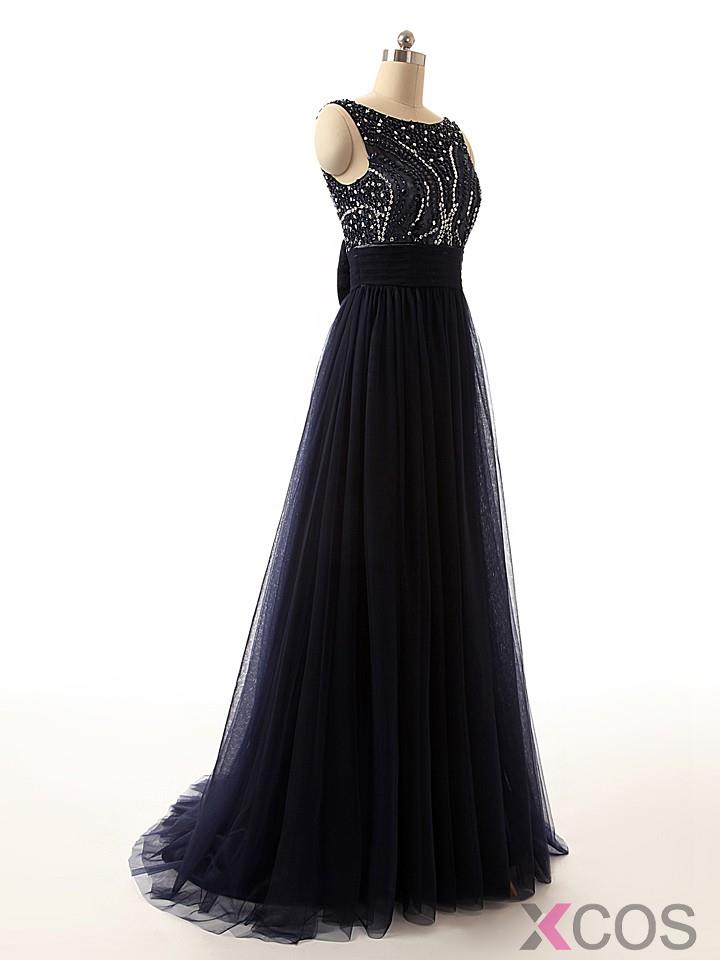 • Simple Dress Elegant Beading Scoop Open-back Ribbon Black Long Tulle Prom Dresses, Evening Dresses  TUPD-7120