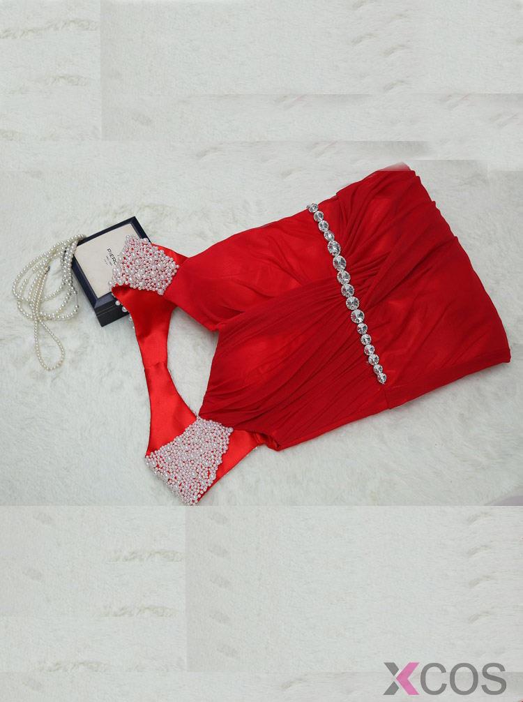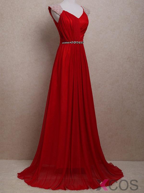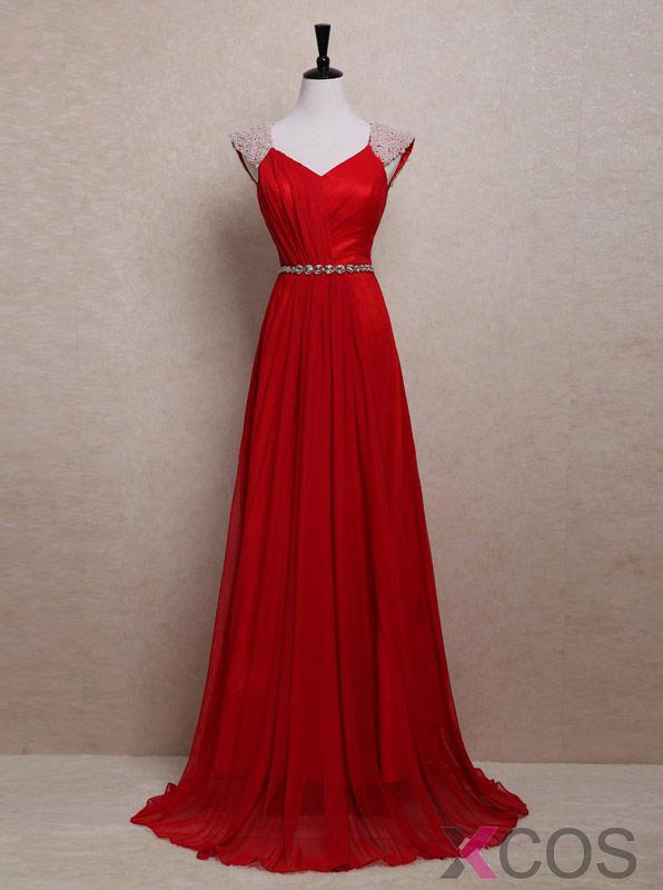 • Simple Dress Elegant White Pearl Capped Long Red Chiffon Prom Dresses/Wedding Reception Dresses/Evening Dresses  CHPD-7017
