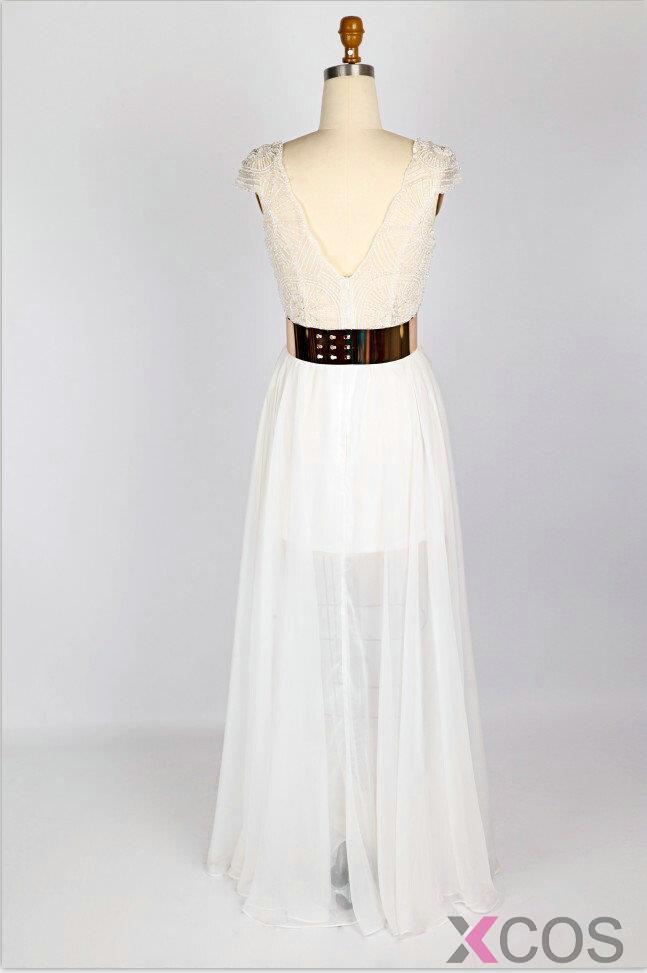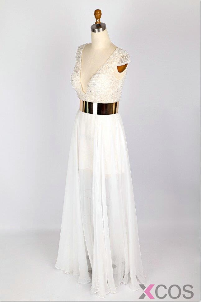 Simple Dress Fashion 2015 Wedding Dresses, V-neck Lace Beading Dresses, Gold Sash Chiffon Long Wedding DressesCHWD-7071