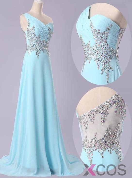 Simple Dress Hot-selling A-line Beading One-shoulder Illusion Back Light Sky Blue Long Chiffon Prom Dresses/Evening Dresses CHPD-7008