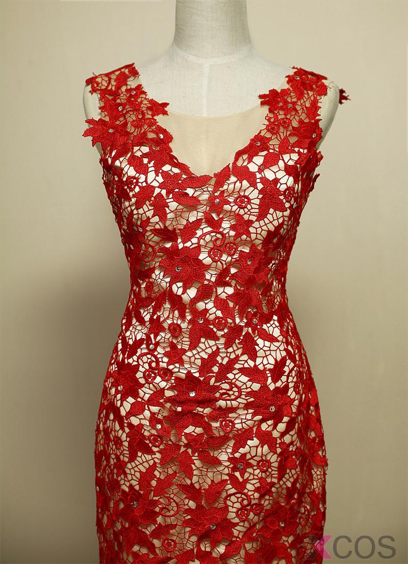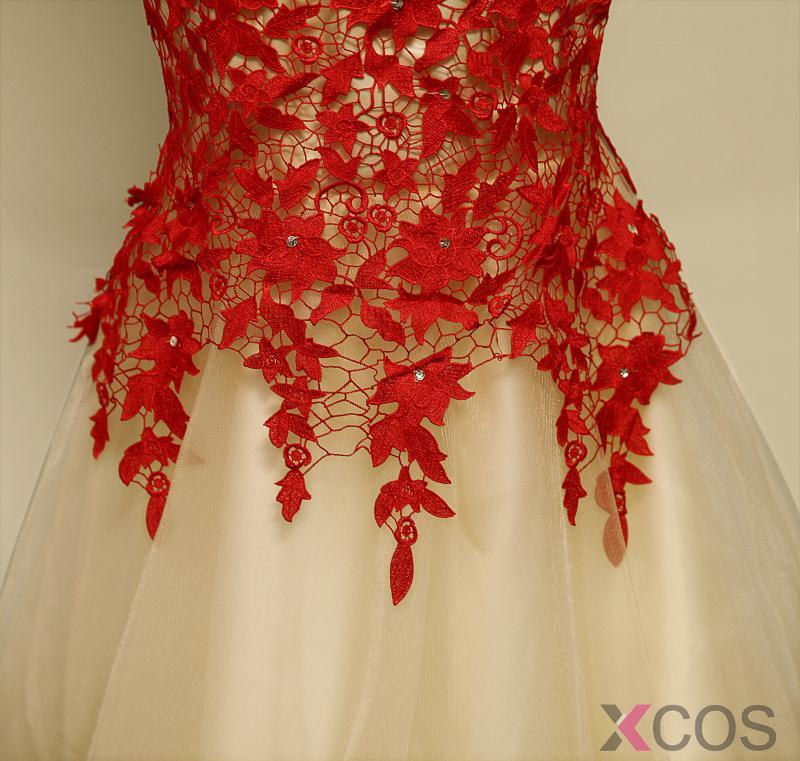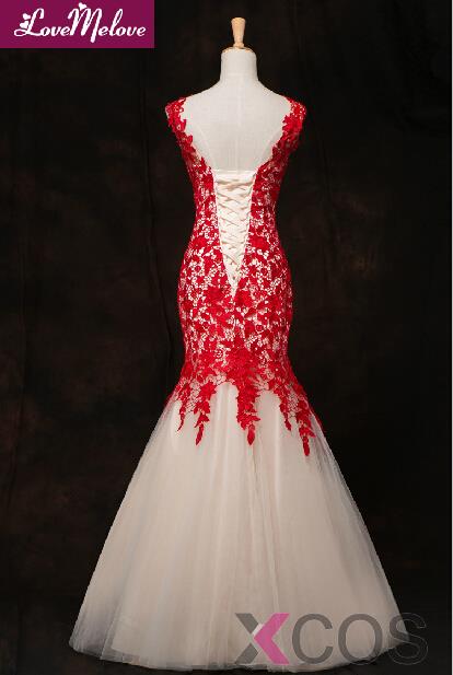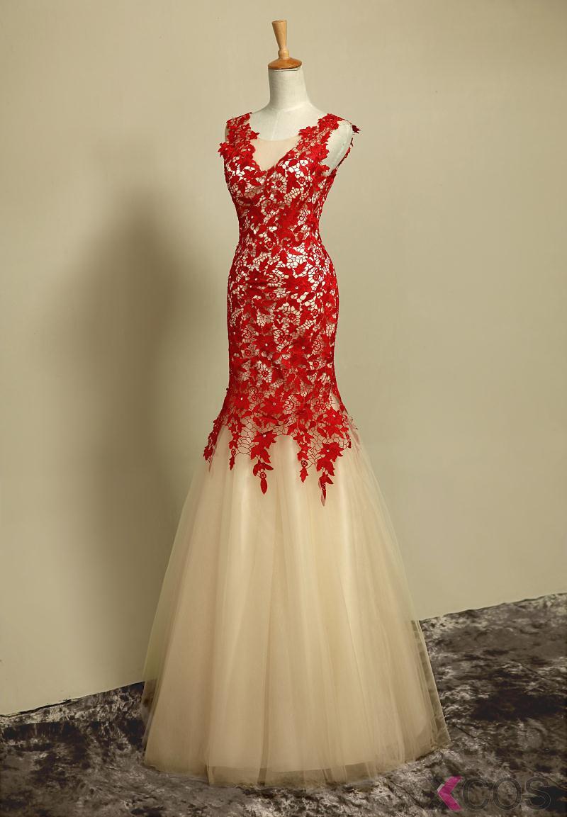 • Simple Dresses Elegant Mermaid Halter Long Scoop Red Applique Light-champagne Tulle Prom Dresses/Evening Dresses  TUPD-7007