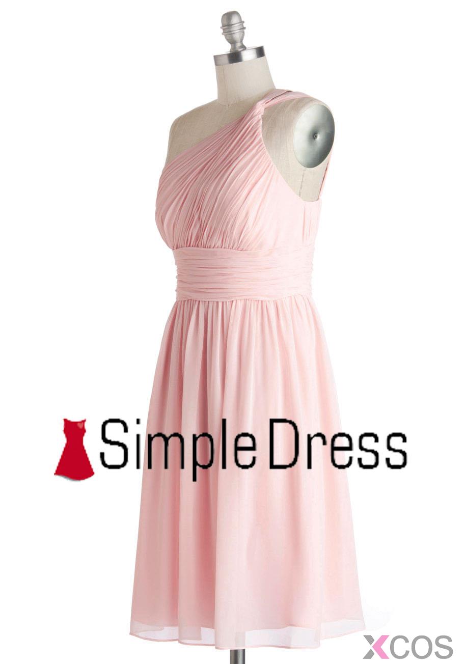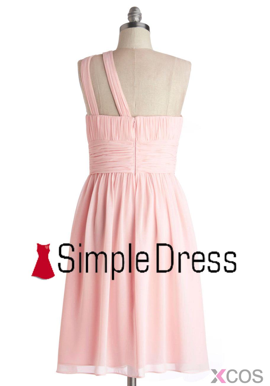 • Simple One Shoulder Pink Short Knee Length Chiffon Bridesmaid Dress CHBD-80067