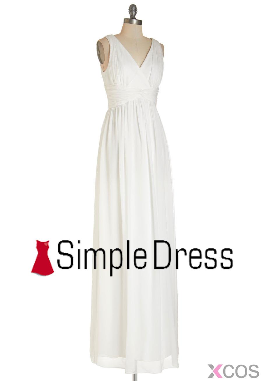 Simple White V Neck Sleeveless Floor Length Chiffon A Line Bridesmaid Dress CHBD-80064