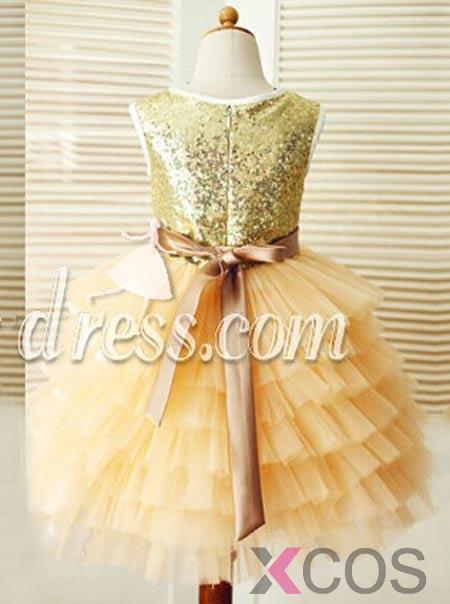 Simple-dress 2015 Gold Scoop Ball Gown Tulle Ruffles Flower Girl Dress TUFGD-8119