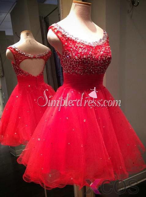 Simple-dress 2015 Modern A-line Scoop Sleeveless Mini Tulle Beading Red Homecoming Dress/Cocktail Dress/Party Dress TUHD-81160