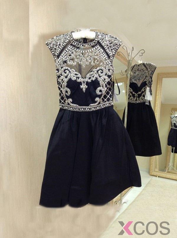 Simple-dress Handmade Beaded Capped High-neck Dark Navy Short Homecoming Dresses.Cocktail Dresses CHHD-70723