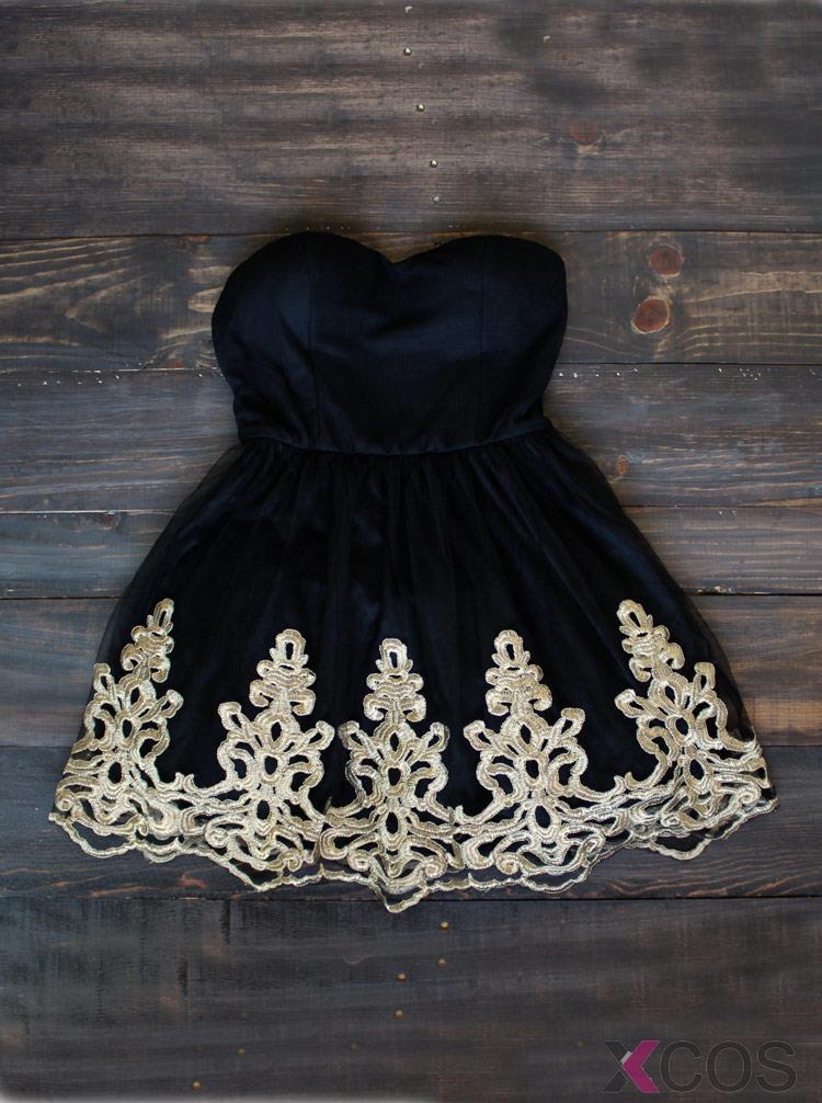 Gorgeous black dress featuring a padded bust, sweetheart neckline, lined gorgeously with gold baroque inspired lace, and a tulle overlay a-line skirt for that perfect fit. Perfect for homecoming, prom, or any other events