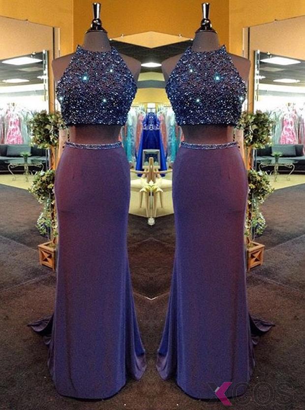 Two Piece Prom Dress/Evening Dress - Crew Neck Sheath Beading