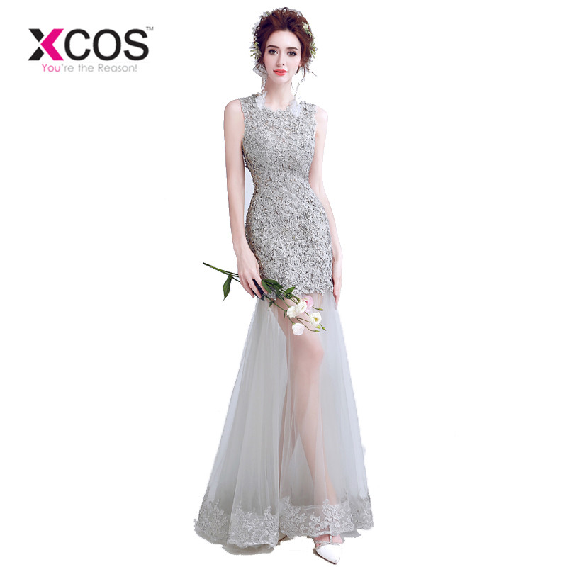 XCOS Elegant Grey Mermaid Prom Dresses Lace Dress Sexy Women Appliques Beading Long Evening Gowns gala jurken