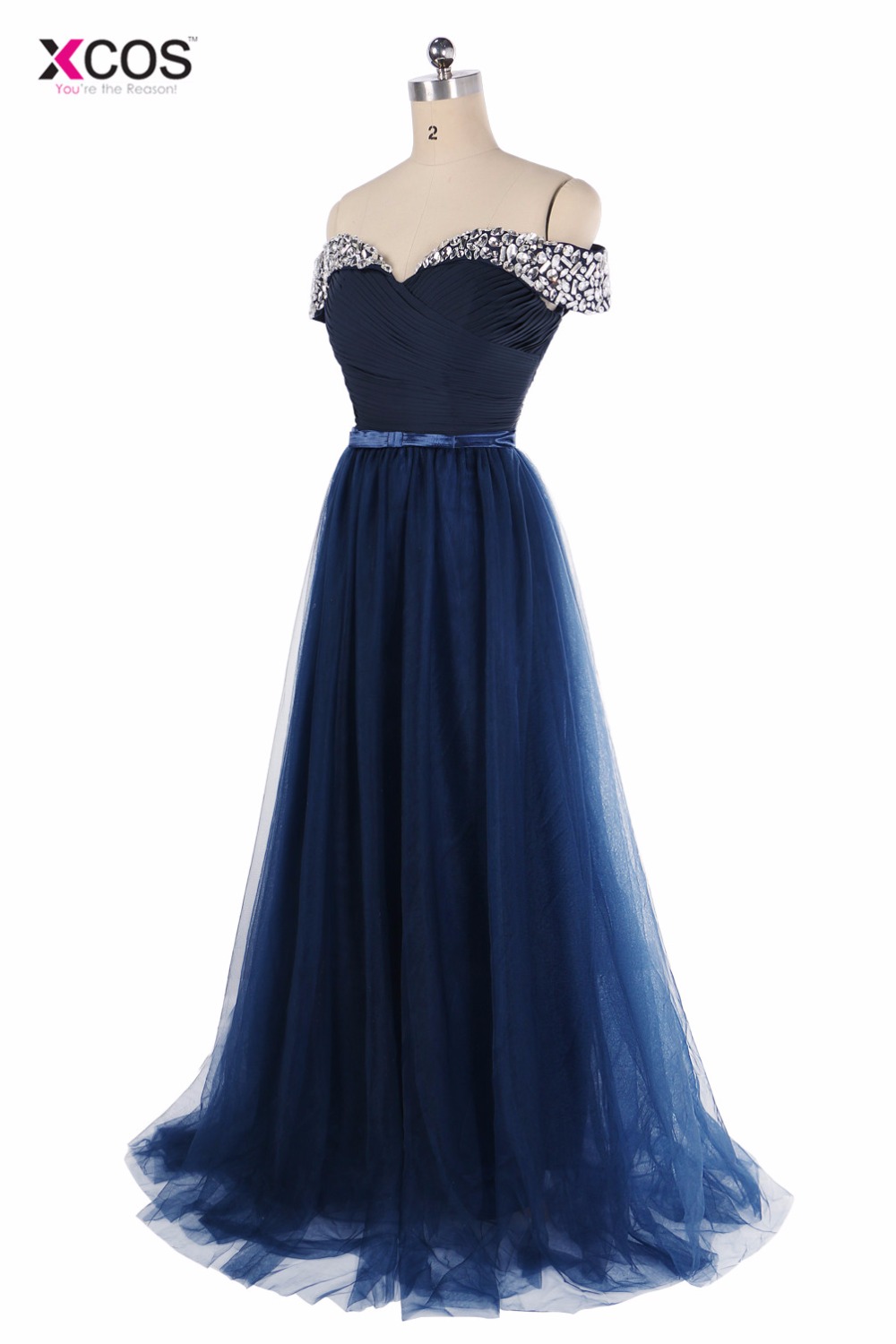 XCOS Elegant Off the Shoulder Navy Blue Prom Dresses 2018 Beading Tulle Crystal Long Evening Gowns abiti da cerimonia donna