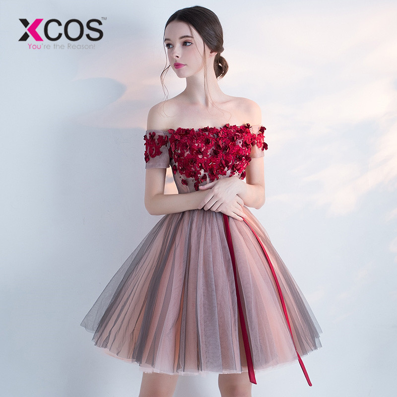 XCOS Short Prom Dress Boat Neck Flowers Beaded Formal Dress Women Occasion Party Dresses 2018 New Fashion