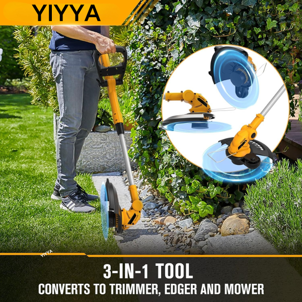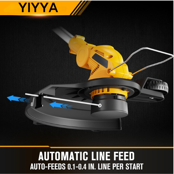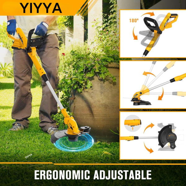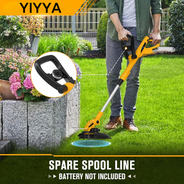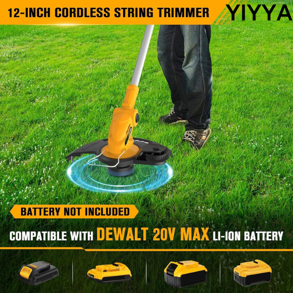 Brand: YIYYA Power Source: Battery Powered Color: Yellow Item Weight: 3.7 pounds Cutting Width: 12 inches NOTE: Battery and charger not included! Tool only! Compatible with DeWalt Batteries: Battery and charger not included! YIYYA cordless weed wacker compatible with DeWALT 20V MAX lithium-ion batteries, for DCB200 DCB201 DCB203 DCB204 DCB205 DCB206 DCB207 DCB208 DCB210 DCB230 DCB240, etc. Giving professionals who already own a DeWalt 20V battery the flexibility to use their preferred battery. 3-IN-1 Tool: YIYYA 12" battery weed wacker can freely switch between precision string trimmer, in-line wheeled edger and mini lawn mower to meet your various needs. Two Major Design Upgrades: YIYYA battery powered weed eater upgrades copper wire motor, no-load speed up to 8500RPM, more powerful and lower noise. Upgraded patented spool system, say goodbye to the grass line that is easily loose and messy during installation, making your garden mowing and lawn trimming easier. Ergonomic Design: YIYYA cordless weed eater is equipped with a 180° adjustable auxiliary handle, and the cutting head is tilted 0-90°. You can adjust the angle according to the space and terrain requirements and complete the trimming easily. The 180° rotating handle provides more options for people who are accustomed to using their left hand. Automatic Line Feed: YIYYA weed wacker battery operated adopts automatic line release and cutting spool system, which can feed the line instantly by pressing the start switch. Specs: YIYYA cordless weed trimmer weighs 3.7 lbs, total length 2.7-3.6 ft, cutting diameter 12 in, cutting line length 2*16.5 ft, line diameter 0.065 in.