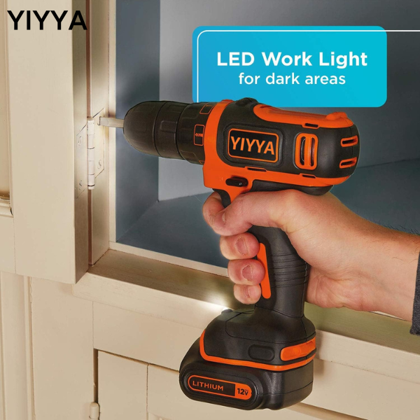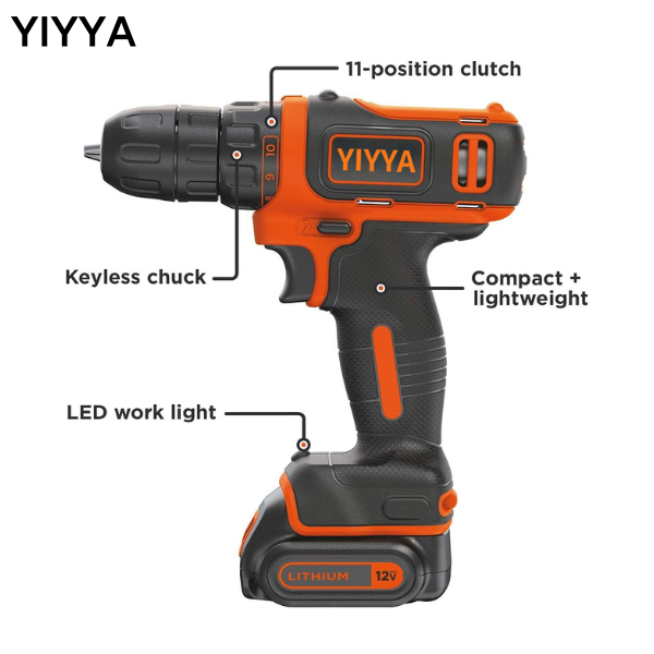 Brand: YIYYA Power Source: Battery Powered Maximum Rotational Speed: 550 RPM Voltage: 12 Volts Maximum Chuck Size: 10 Millimeters Style: Cordless Drill Kit Only Keyless chuck for quick and easy bit changes Compact and lightweight to fit into tight spaces 11 position clutch for precision control LED work light illuminates the surface for easier drilling in dark places