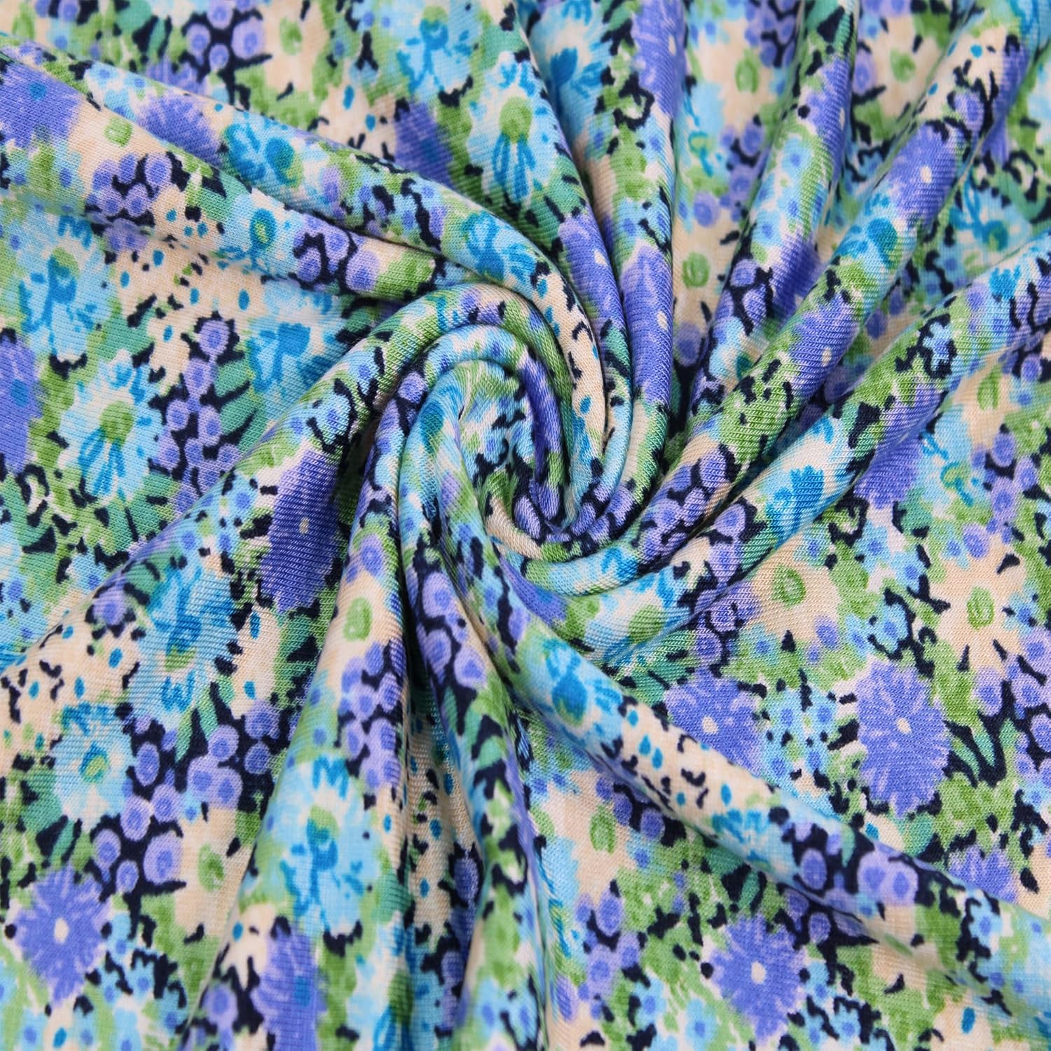 Brand: InMemory Color: Lavender Aqua Size: 1 Yard - 60" Wide Material: Rayon, Spandex Fabric Type: Printed Rayon Spandex Jersey Knit MATERIAL - The fabric blends of 95% rayon and 5% spandex. FEATURES - This fabric is comfortable and stretchy, offering moisture-wicking properties, minimal wrinkling, vibrant color retention, and a soft hand feel, making it versatile for various styles and occasions while being easy to sew and layer and providing good recovery to maintain shape over time. ITS USES - The fabric can be used to create a variety of finished products, including fitted tops, leggings, casual dresses, and skirts for apparel; sports bras and yoga pants for activewear; accessories like soft headbands, lightweight scarves, and stylish tote bags; school projects, including costumes and sewn items like pencil cases; and children's clothing such as comfortable play dresses and soft pajamas. TRENDY AND FASHIONABLE- Stay on-trend and be amazed with our wide range of colors that perfectly match current fashion trends in any season. The fabric is available in continuous cuts, so you can get the exact length and size needed for your designs and crafts. COLOR - Different monitors cause photos to look paler or darker, and we can't guarantee that the actual fabric will be as exact as the one in the photo. We highly suggest getting color cards or sample cuts to see the actual color of the fabric.