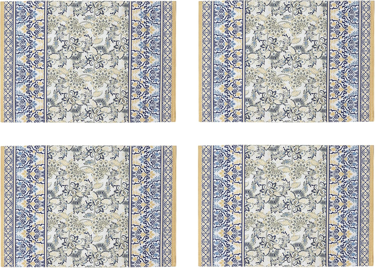Brand: InMemory Size: 19"L x 13"W Set of 4 Color: Yellow and Blue Floral Material: Fabric Easy Care 100% Polyester, Stain and Water Resistant, Wrinkle Free Fabric Tablecloth Provence Allure Arabesque Yellow and Blue Floral Bordered Country French Fabric Tablecloth Collection by InMemory, Indoor Outdoor, Stain and Water Resistant Set of 4 Placemats. Set of 4 Bordered Print Fabric Placemats - 13" x 19" Styling: The Provence Allure Arabesque Yellow and Blue Floral Bordered Country French Fabric Tablecloth by InMemory is indoor and outdoor, stain resistant, water resistant, and wrinkle free. This beautiful floral comprised of arabesque flowers and shapes features rich blue motifs accented with bold yellow on fully engineered borders of yellow and blue bands on a white background. Features: Easy Care Indoor and Outdoor Tablecloths for Kitchen, Dining Room, Patio, Barbeques, Picnics and Restaurants. Perfect for Spring, Summer and Year Round Dining Entertaining, and Decorating. 100% Polyester Easy Care, No Iron, Stain Resistant fabric CARE INSTRUCTIONS: Easy Care advanced 100% polyester construction is machine washable in cool or warm water - no bleach. Tumble dry at lowest setting and requires little or no ironing. Wash dark colors separately.